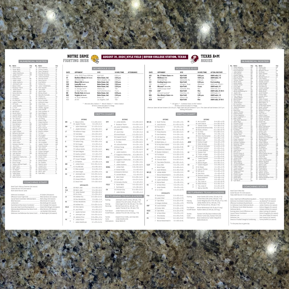 For sale, the game issued Flipcard and Media Program Notes from the legendary college opener game Notre Dame at Texas A&M. August 31, 2024. At Texas A&M Date: AUGUST 31, 2024 Stadium: KYLE FIELD Location: BRYAN-COLLEGE STATION, TEXAS What you get: 1. 11x17 Game Issued Media Issued Flipcard - Notre Dame vs Texas A&M 2. Texas A&M Media Program Game Note (1-page) 3. Notre Dame Media Program Game Note (1-page) 4. Plastic protector sheet