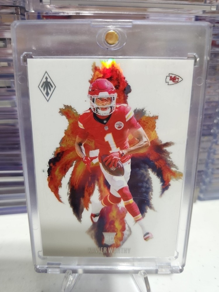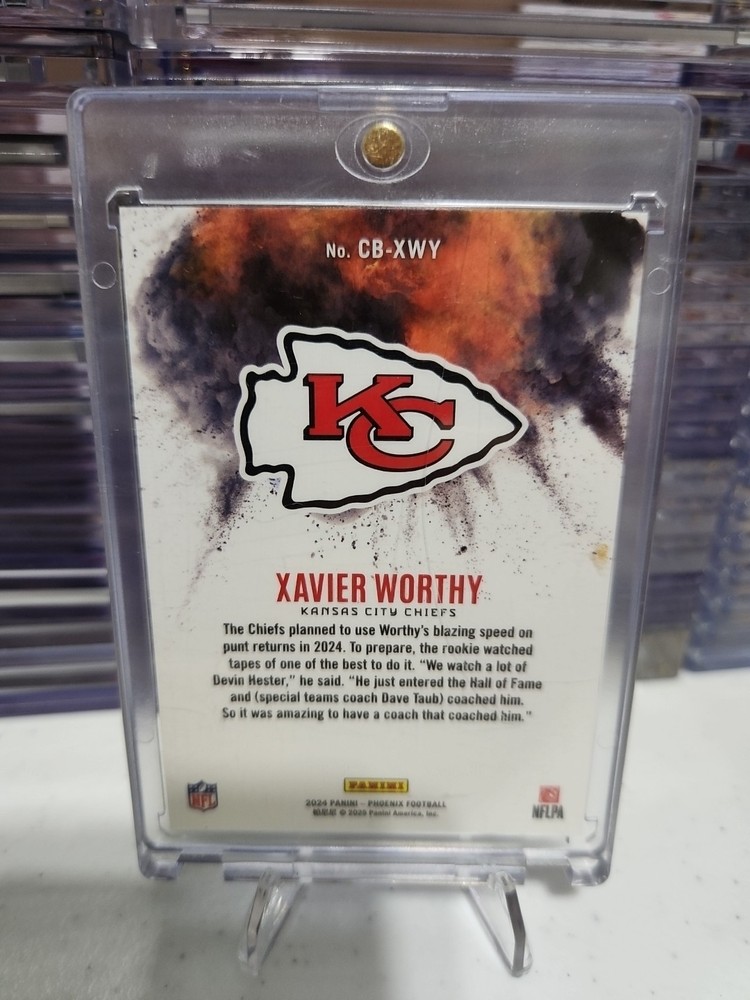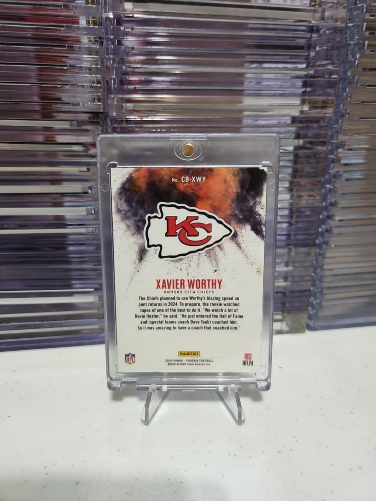 The product is a 2024 Panini Phoenix trading card featuring football player Xavier Worthy! This particular card is from the Color Blast series, known for its vibrant and eye-catching designs! As a collectible item in the sports trading card market, this card would be sought after by fans and collectors looking to add a unique and special piece to their collection! With its exclusive design and limited availability, the Panini Phoenix Xavier Worthy Color Blast card is a valuable and desirable item for football enthusiasts!