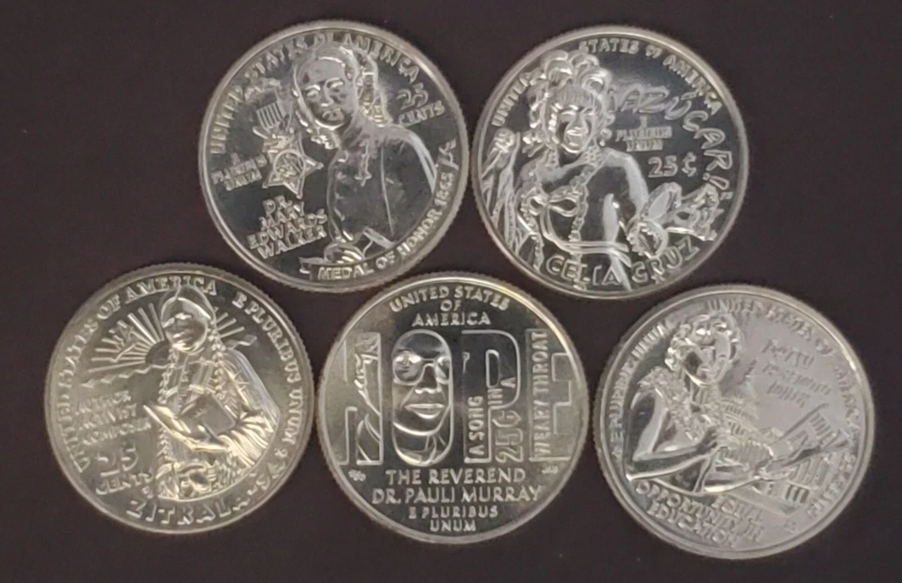 ALL Honorees in hand and ship today + Gift with purchase 2021 100th Anniversary Blue Nose Schooner CDN 3 coin set see picture SAME DAY or NEXT DAY SHIPPING 15 coin set PDS From US MINT SPECIAL WRAP ROLLS not BAGS All coins are glove handled, in a climate controlled, smoke free, pet free environment. The coins are placed in a tube, secured in place with organic cotton. The tube is then wrapped in bubble wrap. Then placed in a 6 x 6 x 2 corrugated box, so they cannot move inside the box. Your coins are protected and secure during shipment. The coins you are buying are FIRST STRIKE from all three Mints (P-D-S) and are a superior grade of uncirculated. Don't be taken in by "from bank rolls etc" these are Uncirculated Coins sold exclusively by the Mint for collectors. Uncirculated from US MINT SPECIAL WRAP ROLLS The condition "Uncirculated" refer to coins showing no trace of wear. Such coins may vary slightly due to minor surface imperfections. This will include, contact marks, blemishes in prime focal areas, impaired luster, spots, dings, & scratches. An above average uncirculated coin may be brilliant and have very few contact marks. Uncirculated has several subdivisions including Perfect, Gem, Choice, and Uncirculated. (MS 60 to MS 70.) The above paraphrasing was extracted from the Whitman Publishing "Red Book" and the NGC website. 2024 Honorees Patsy Takemoto Mink – first woman of color to serve in Congress. IN HAND Dr. Mary Edwards Walker – Civil War era surgeon, women’s rights advocate, and abolitionist. IN HAND Pauli Murray – poet, writer, activist, lawyer, and Episcopal priest. >>>>>IN HAND Zitkala-Ša (“Red Bird”) – writer, composer, educator, and political activist.>>>>> IN HAND Celia Cruz – Cuban-American singer, cultural icon, popular iconic, Latin Artist of the 20th century. RELEASE DATE Oct 28, 2024 The business strike "S" 2024 Quarters are extremely rare. Only 480,000 "S" MINT Business Strike Coins of each Honoree have been minted in 2024. Consider the 2020 S Washington/Weir Farm Quarter minted 2,000,000 Business strike coins, that regularly sells for around $25 each. Avoid future regrets. Here is your opportunity to own all five rare 2024 "S" mint quarters. Low mintage and superior condition dictate