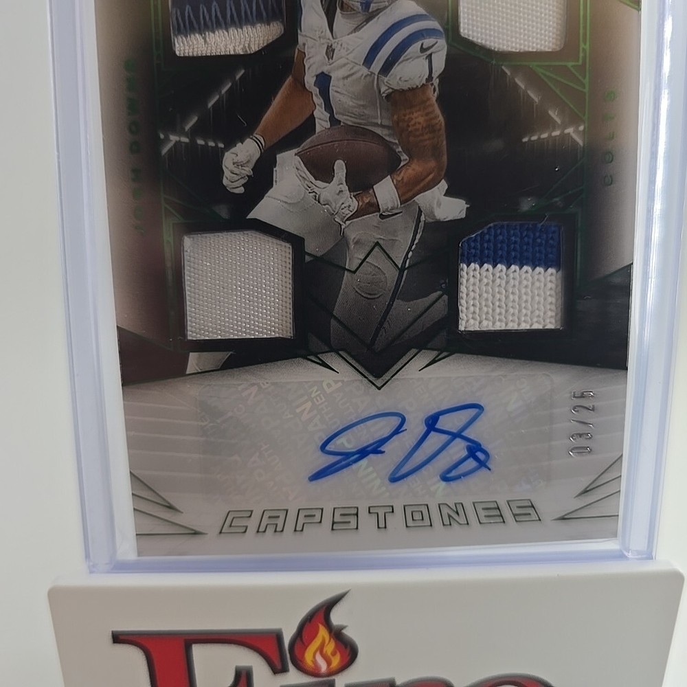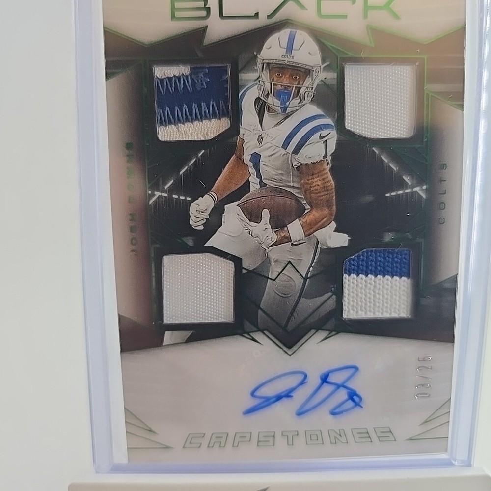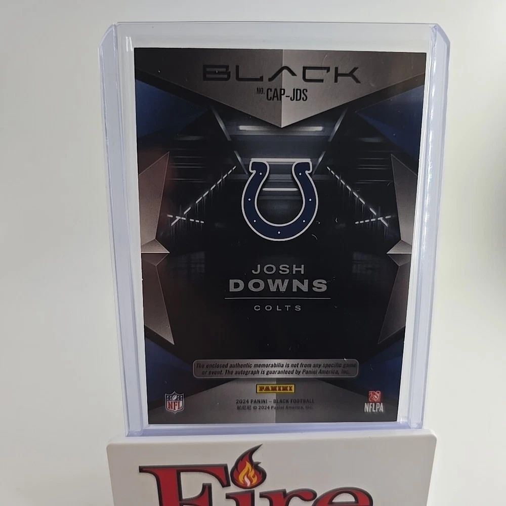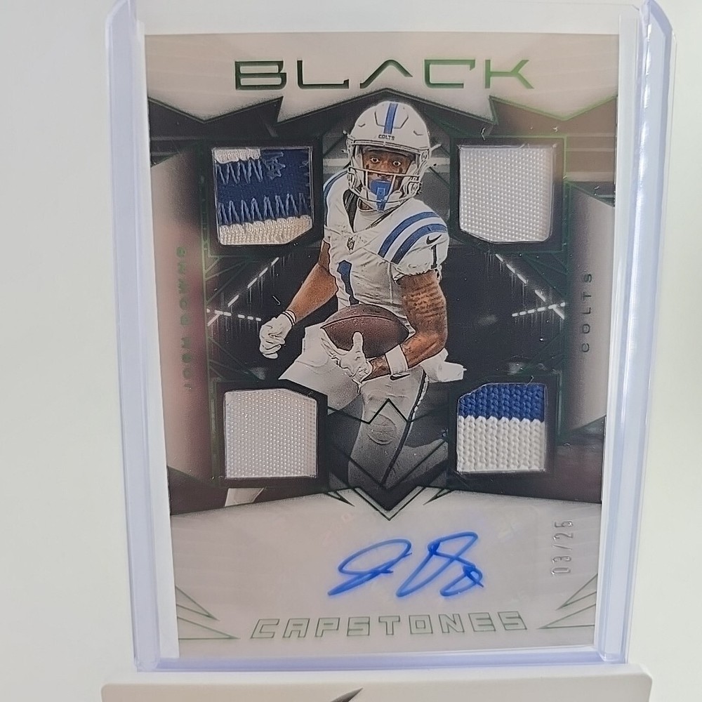 This is a 2024 Panini Black Emerald Capstones #CAP-JDS trading card featuring Josh Downs of the Indianapolis Colts. This autographed card is serial numbered 3/25 and includes four pieces of memorabilia. It is a limited edition Emerald insert from the Panini Black set, signed by Josh Downs. Great for any Colts fan or Nfl fan. Thank you for your interest, don't let it get away bid today!