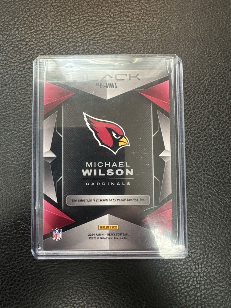 Capture the essence of the gridiron with the 2024 Panini Black Michael Wilson Instant Impact Shadowbox Auto card, an essential addition to any football card enthusiast's collection. This limited edition collectible, with a print run of just 249, features a striking autograph from the Arizona Cardinals' standout, Michael Wilson. The card is a true representation of sports memorabilia excellence, complete with an insert that highlights its exclusivity. This card is part of the renowned 2024 Panini Black set, recognized for its premium quality and design. It is serial numbered to ensure authenticity and boasts a unique Impact parallel/variety that stands out. As an official NFL-licensed trading card, it is a must-have for fans and collectors alike, offering a piece of the National Football League's thrilling 2024 season.