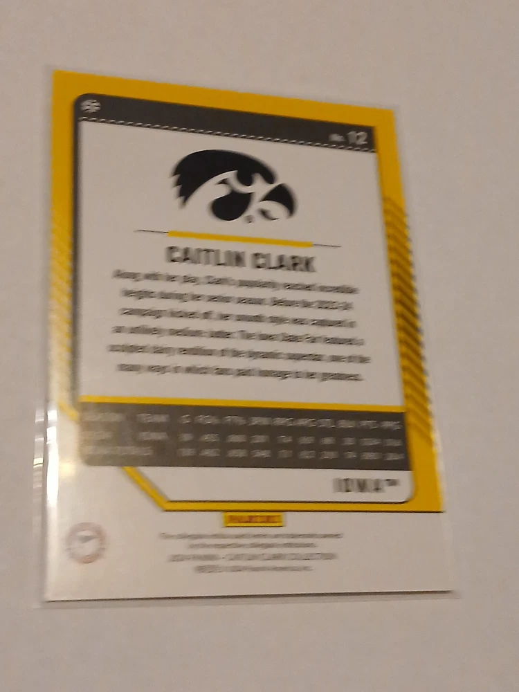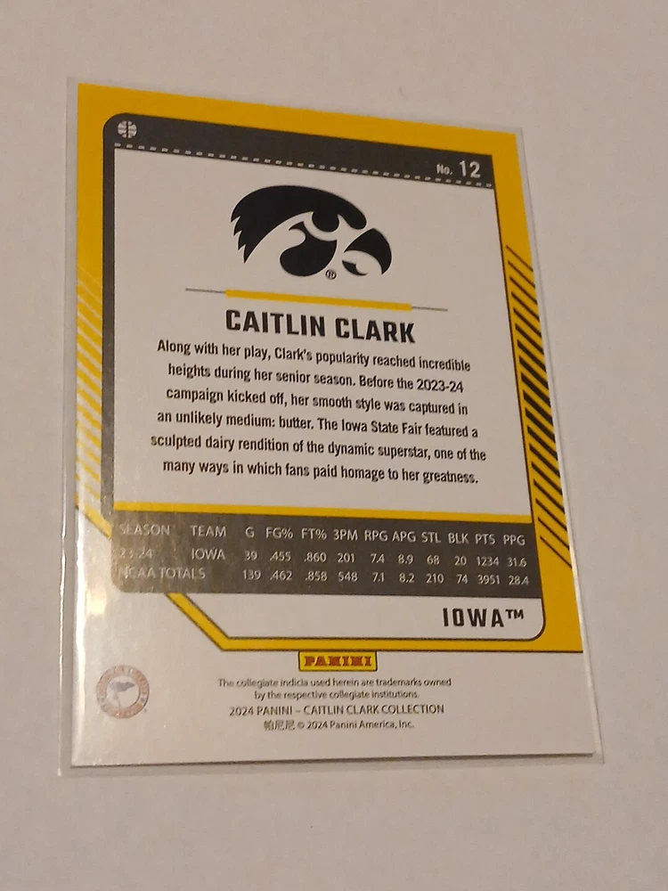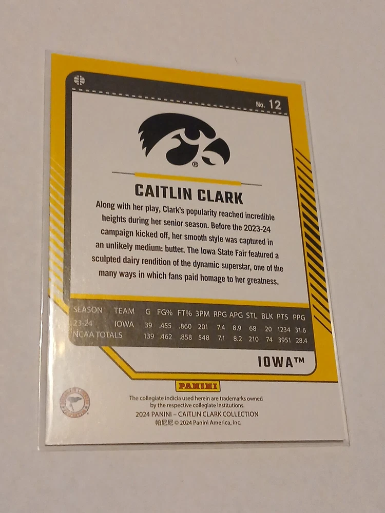 This 2024 Panini Caitlin Clark Collection sports trading card features the rookie and insert set, with card number 12 in the Base Donruss set. The card showcases the basketball player Caitlin Clark, who plays for the National Collegiate Athletic Association (NCAA) league. The card is manufactured by Panini and is part of the 2024 season set. This trading card is perfect for fans and collectors who appreciate the sport of basketball and the NCAA league. It is a great addition to any collection or as a standalone piece for display. Get your hands on this unique and rare card today!