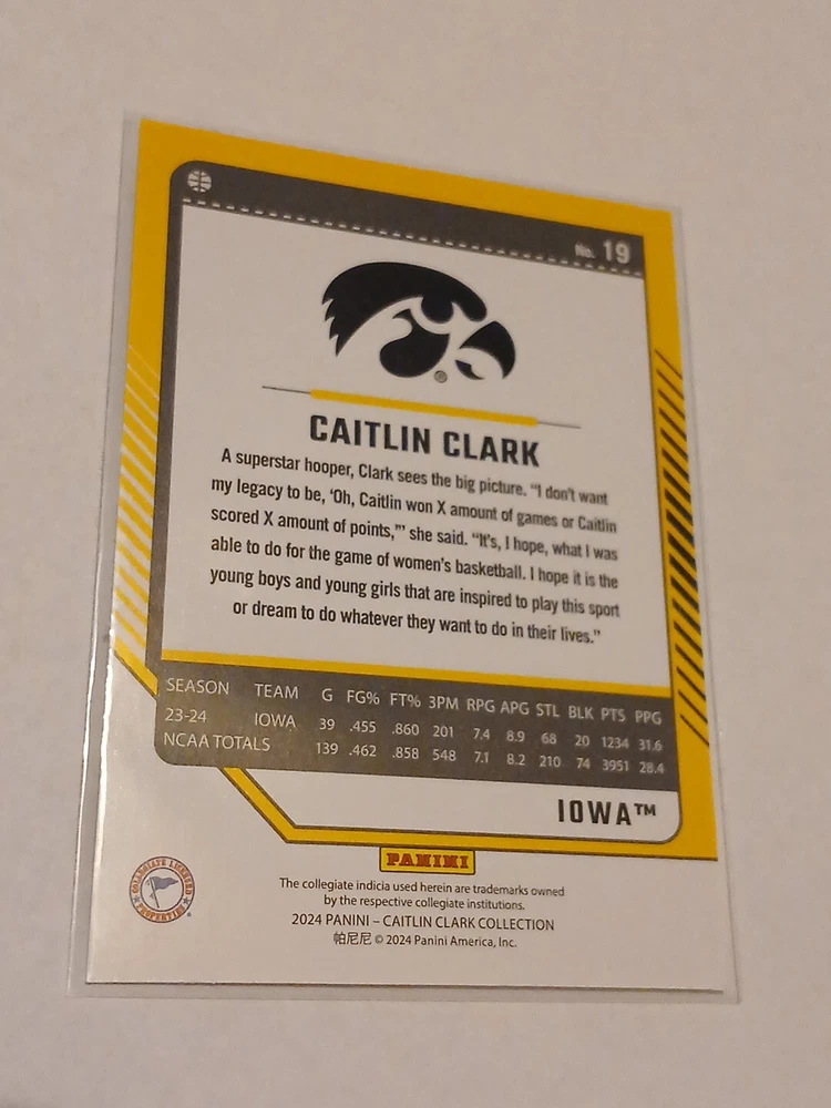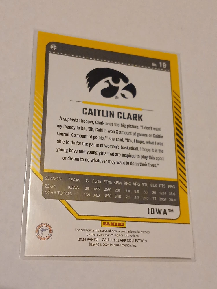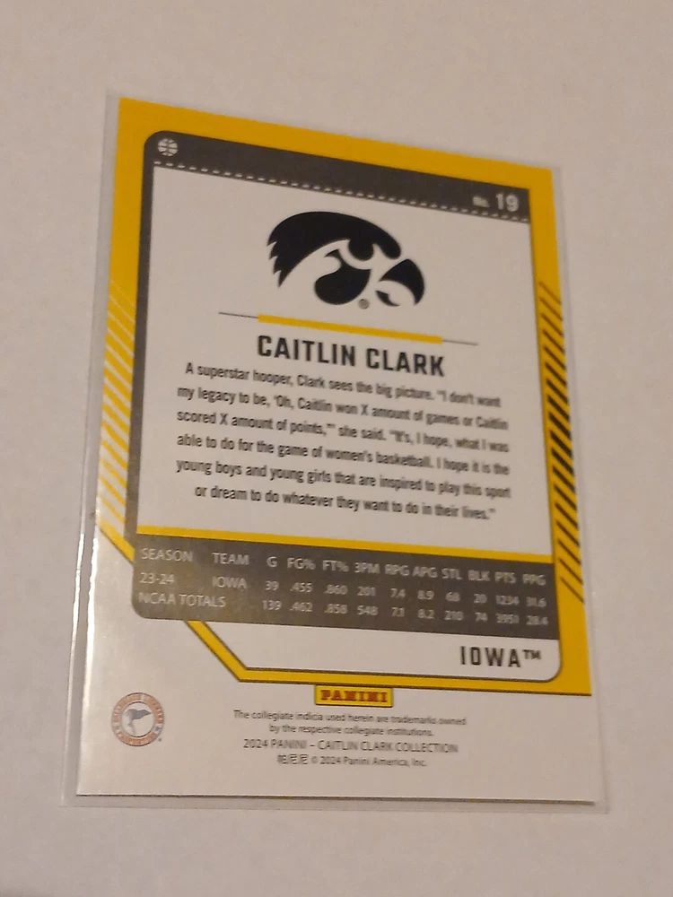 Parallel/Variety: [Base] League: National Collegiate Athletic Association (NCAA) Autograph Authentication: Donruss Season: 2024 Card Number: 19 Manufacturer: Panini Insert Set: Base Donruss Team: Iowa Hawkeyes Type: Sports Trading Card Set: 2024 Panini Caitlin Clark Collection Sport: Basketball Player/Athlete: Caitlin Clark Features: Rookie, Insert