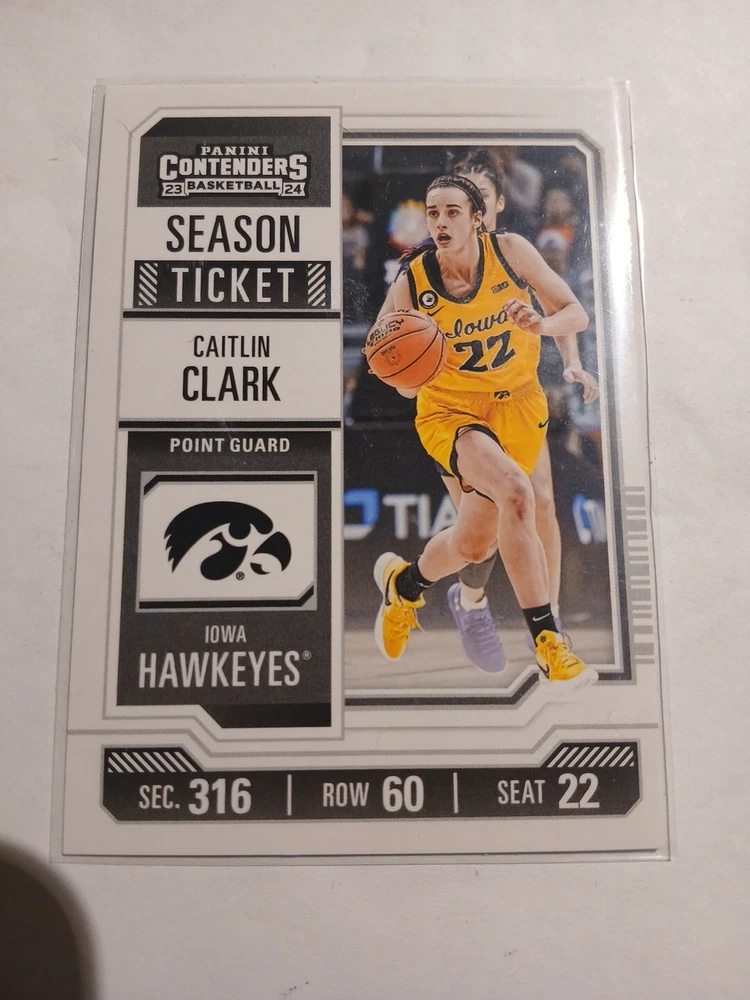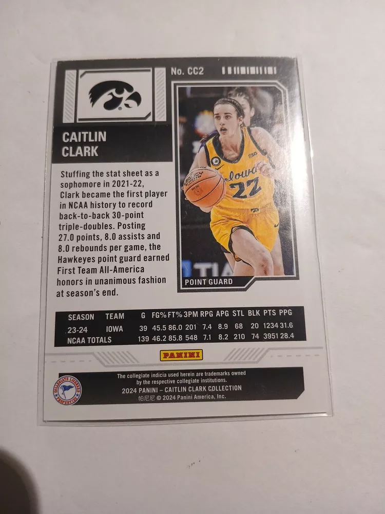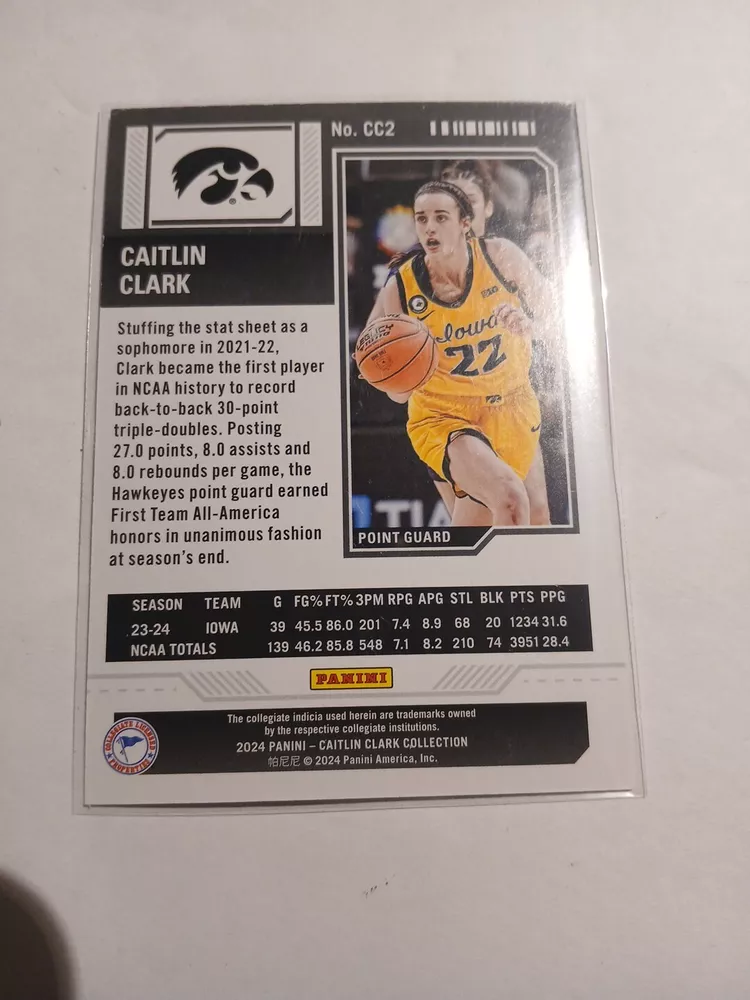 This 2024 Panini Caitlin Clark Collection sports trading card features the rookie and insert set, College Contenders, with card number CC2. The card showcases the basketball player, Caitlin Clark, who is part of the National Collegiate Athletic Association (NCAA) league. The card is manufactured by Panini and is a great addition to any sports trading card collection. The season for this card is 2024 and it falls under the category of Sports Mem, Cards & Fan Shop and Trading Card Singles.