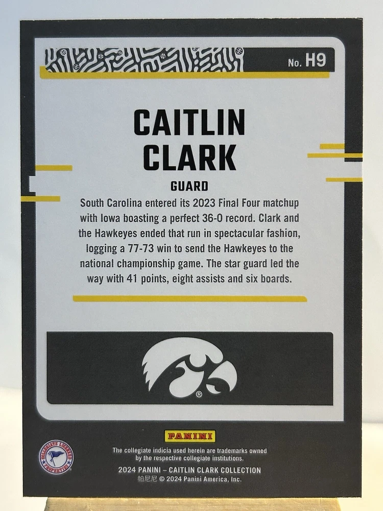 Set: 2024 Panini Caitlin Clark Collection Autographed: No League: National Collegiate Athletic Association (NCAA) Card Number: H9 Card Name: Red Holo Features: Parallel/Variety Season: 2024 Parallel/Variety: Red Foil Manufacturer: Panini Player/Athlete: Caitlin Clark Type: Sports Trading Card Team: Iowa Hawkeyes Sport: Basketball