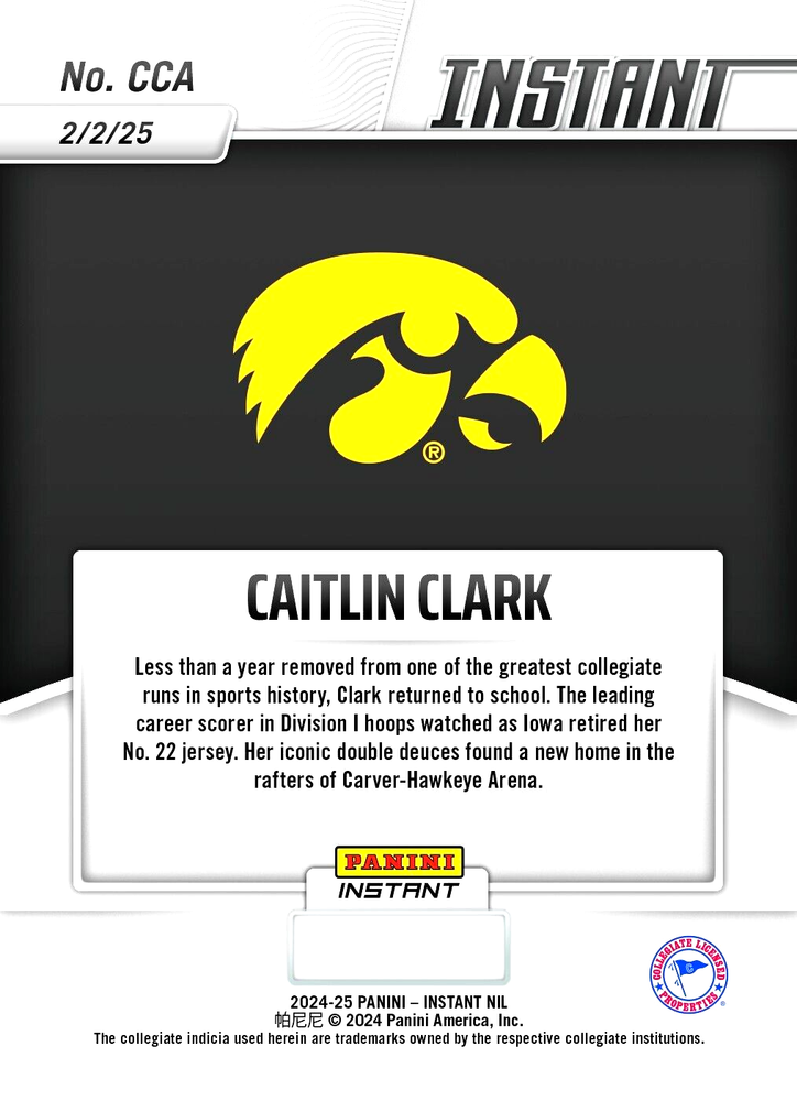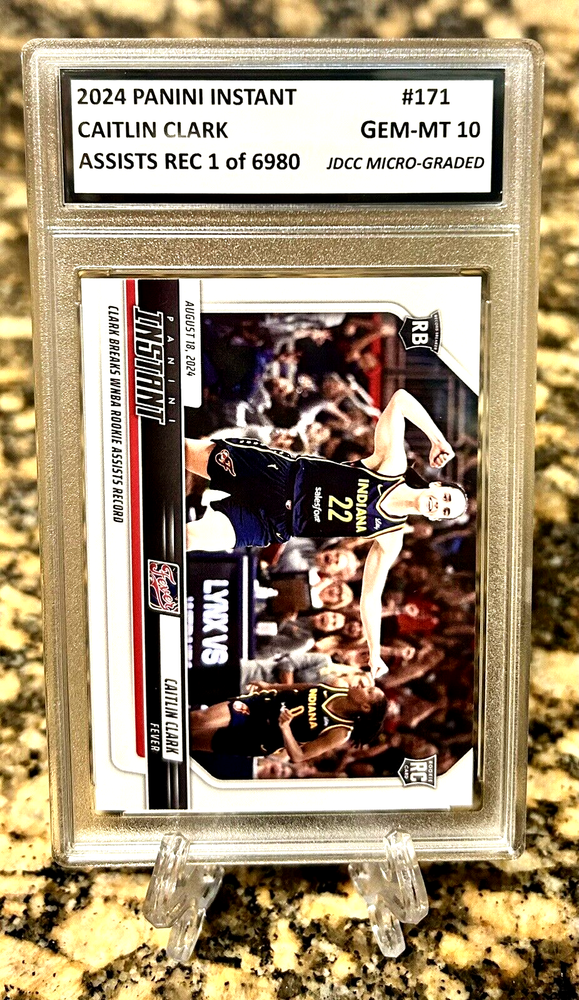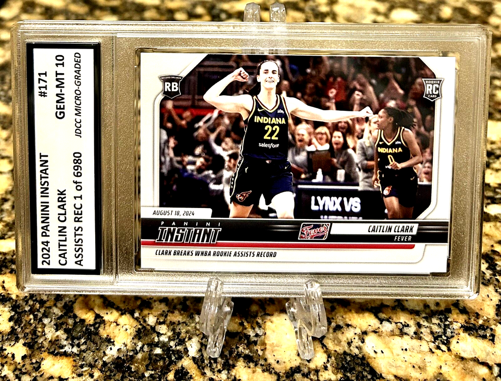 This is a Presale Order Set for 40 Day Delivery. The #171 card is just an Example of what the BRAND NEW Iowa Retires Jersey #CCA card will look like GRADED GEM-MT 10. You will receive a JDCC Authorized & Inspected AUTHENTIC MEMORABILIA Micro Graded GEM-MT 10 2024-25 Panini Instant CAITLIN CLARK 2024 Iowa Retires #22 Jersey GRADED GEM-MT 10 Rookie #CCA. W/H COA! Cards are Professionally inspected, encased and sealed by JDCC - JD’S Coins & Collectibles Inc.! This item is encased in a Crystal Clear Slab with tamper proof #'d hologram sticker and Certificate of Authenticity marked label for extra security and authenticity! The matching SERIAL #’D JDCC COA will accompany this item. Any tampering or removal of the hologram labels will void the JDCC grading authenticity of the item encased. For further protection the case is fitted with a plastic sleeve. It is best to keep the item in the plastic sleeve to protect the slab from any scratches, etc. This is a beautiful product for display and safekeeping! PLEASE FOLLOW OUR STORE FOR NEW INVENTORY & EXCLUSIVE OFFERS! I combine shipping at .50 cents per additional item capped at $9.99. International rates are $14.99. Feel free to send me offers for multiple items and qualify for discount shipping rates and lower costs per item! I send daily invoices every morning so be sure to wait for your combined shipping invoice before checkout or request an invoice when you are ready to pay. Please keep in mind shipping and handling fees don't just cover postage but also ebay/paypal fees, supplies, taxes and other costs. 5 Star feedback is Greatly appreciated and FOLLOW our store for New Inventory! Good luck and enjoy!