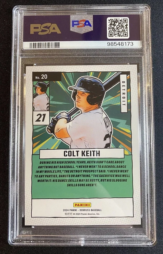 For avid collectors of baseball trading cards, here's a rare find for you! This 2024 Panini Donruss Diamond Marvels Colt Keith Holo Silver /199 card has been professionally graded by the Professional Sports Authenticator (PSA) with a perfect score of 10. This card features the rookie Colt Keith from the Major League Baseball (MLB) and is a must-have for any fan or collector of baseball memorabilia. The card is a sports trading card manufactured by Panini and is a part of the 2024 season set. With its unique features and limited print run of 199, this card is a valuable addition to any collection. Don't miss out on the opportunity to own this rare and coveted card!