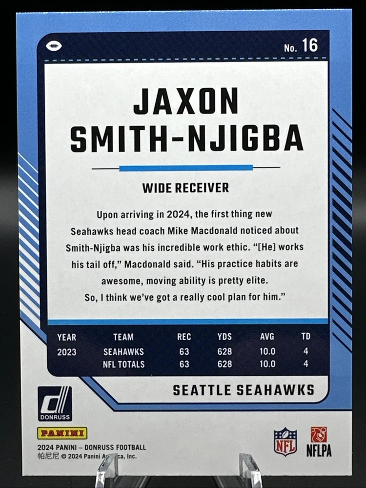 Vintage: No Set: 2024 Panini Donruss Card Size: Standard League: National Football League (NFL) Material: Card Stock Season: 2024 Manufacturer: Panini Country/Region of Manufacture: United States Autographed: No Original/Licensed Reprint: Original Card Name: Press Proof Year Manufactured: 2024 Language: English Player/Athlete: Jaxon Smith-Njigba Parallel/Variety: Press Proof Green Features: Parallel/Variety, Insert Sport: Football Card Number: 16 Team: Seattle Seahawks Type: Sports Trading Card