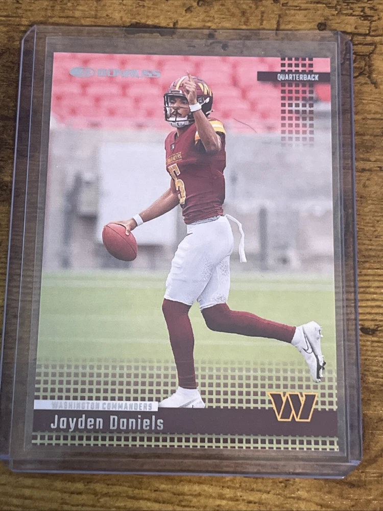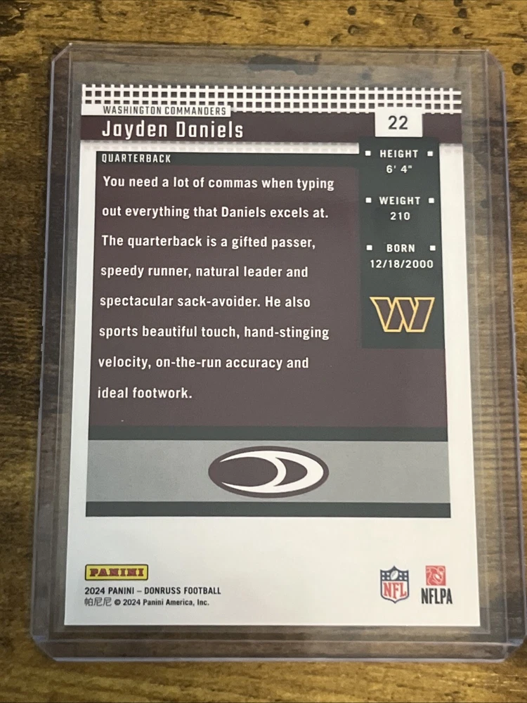 The product is a 2024 Panini Donruss trading card featuring Jayden Daniels, a rookie player for the Washington Commanders in the National Football League (NFL). This card is a Retro parallel from the 1994 set and does not have an autograph. It is part of the Sports Trading Card category and is a single card from the manufacturer Donruss. The card number is 22, making it a desirable collectible for fans and collectors of football trading cards.