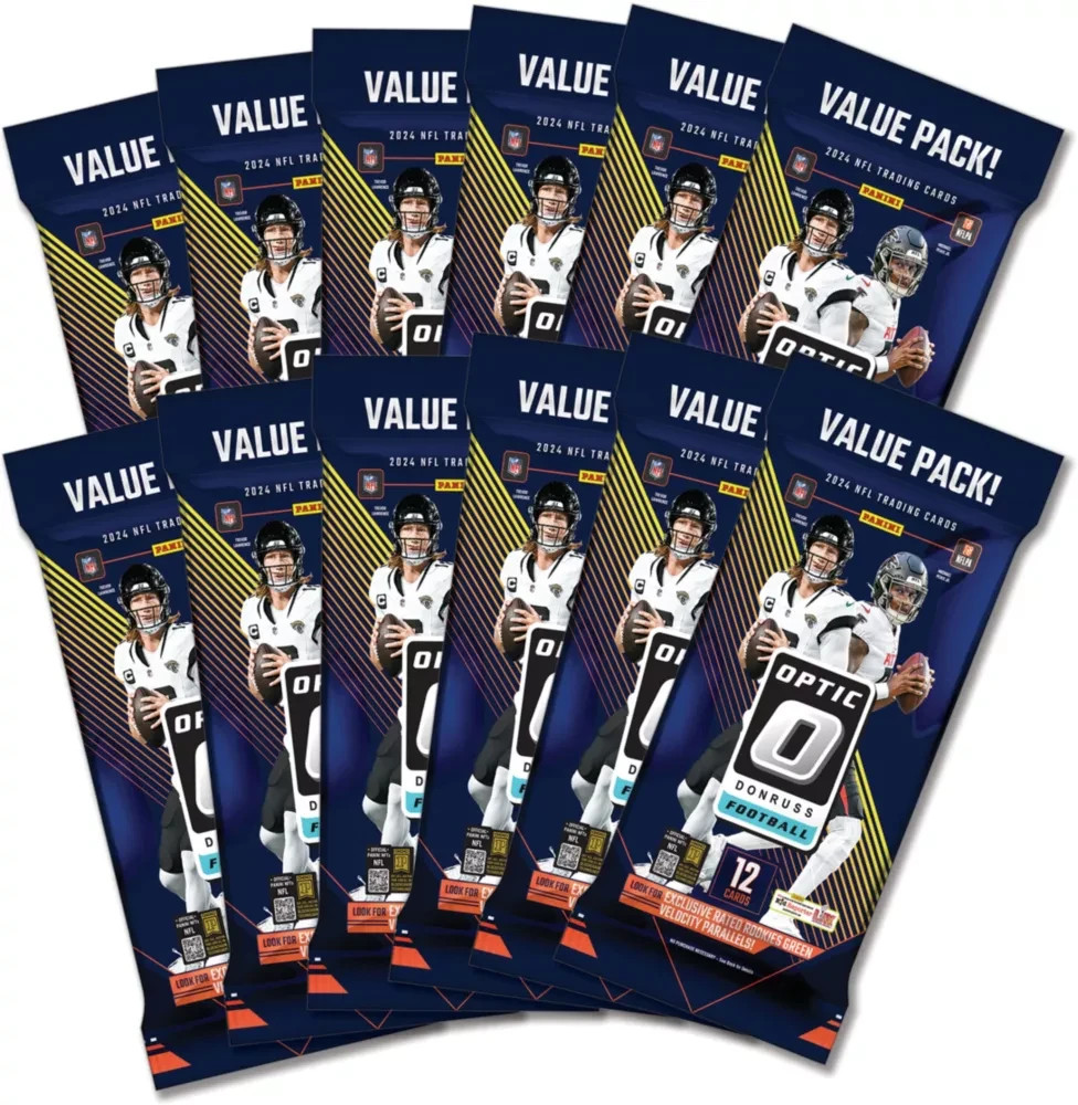 2024 Panini Donruss Optic Football NFL Fat Pack Box – A Must-Have for Football Card Collectors Step into the spotlight of the NFL collecting world with the 2024 Panini Donruss Optic Football NFL Fat Pack Box — one of the most anticipated football card releases of the year. Combining Donruss’ rich heritage with cutting-edge Optichrome technology , this collection delivers vibrant designs, elite player checklists, and thrilling chase cards that every serious collector wants in their hands. The Perfect Blend of Quality and Excitement Each 2024 Donruss Optic Football Fat Pack Box offers exceptional value and excitement straight from the first pack. Inside, you’ll find: 12 cards per pack 12 packs per box That’s a total of 144 trading cards , featuring NFL superstars, promising rookies, and jaw-dropping inserts that define the Donruss Optic legacy. Chase the Ultra-Rare Inserts One of the biggest draws of this release is the hunt for ultra-rare and highly collectible inserts, including: Downtown & Downtown Duos – fan-favorite case hits showcasing top NFL talent in stunning artistic designs Uptowns & Hash Marks – dynamic new inserts that bring the energy of the game to life Exclusive Green Velocity Parallels – found only in Fat Packs, adding an eye-catching burst of color to your collection Every box is a treasure hunt, with rare cards that can take your collection to the next level. Rated Rookies – The Future of the NFL The Rated Rookies subset is a cornerstone of the Donruss Optic series, featuring the brightest young stars from the 2024 NFL Draft Class . From breakout quarterbacks to dynamic playmakers, collectors can chase their favorite rookies in stunning Optichrome finishes — including the exclusive Green Velocity parallels that can only be found in Fat Packs. Autographs from the NFL’s Hottest Players For collectors chasing signed memorabilia, this set doesn’t disappoint. Look for autographs from top NFL veterans and rising rookies , adding even more excitement and long-term value to your box. Each signature represents a piece of NFL history and a potential centerpiece for any collection. Officially Licensed and Authentically Panini Produced by Panini America , the global leader in sports trading cards, this product is officially licensed by the NFL — ensuring that every card features authentic player images, logos, and team designs. With Optichrome technology , every card shines with premium finish and crystal-clear detail. Product Highlights Product Name: 2024 Panini Donruss Optic Football NFL Fat Pack Box Cards per Pack: 12 Packs per Box: 12 (Total of 144 cards) Chase Inserts: Downtown, Downtown Duos, Uptowns, Hash Marks, and more Exclusive Parallels: Green Velocity Rated Rookies Autographs: Featuring NFL stars and top 2024 rookies Brand: Panini America Country of Origin: United States of America Officially Licensed Product All Sales Are Final Content and Ratios Subject to Change Without Notice Why You Should Add the 2024 Donruss Optic Fat Pack Box to Your Collection The 2024 Panini Donruss Optic Football Fat Pack Box isn’t just another release — it’s a celebration of NFL excellence, innovation, and collecting passion. Whether you’re a long-time Panini fan, a rookie card chaser, or simply love the thrill of opening fresh packs, this box delivers an unbeatable mix of style, substance, and collectibility . Get ready to pull rare inserts, chase your favorite rookies, and experience the next generation of NFL collecting with the 2024 Donruss Optic Football Fat Pack Box.