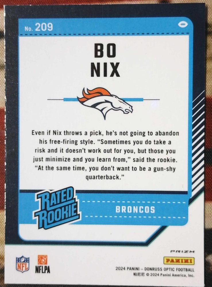 The 2024 Panini Donruss Optic - Rated Rookie Bo Nix #209 Blue Hyper Prizm (RC) is a highly sought-after sports trading card featuring the talented football player Bo Nix from the Denver Broncos. This particular card, part of the 2024 Panini Donruss Optic set, is a Parallel Variety with a Blue Hyper Prizm design, making it a unique and collectible item for fans and collectors alike. As a Rated Rookie card, it holds special significance for those looking to add a piece of Bo Nix's early career to their collection.