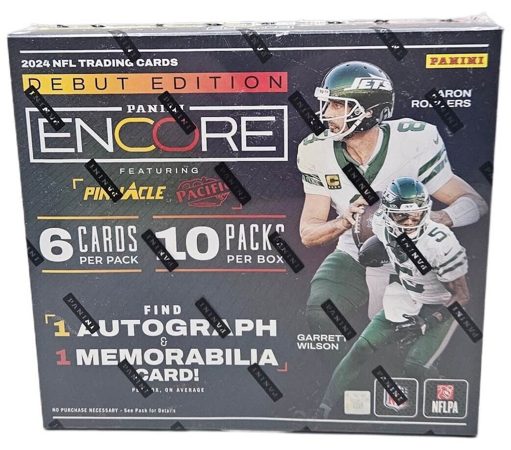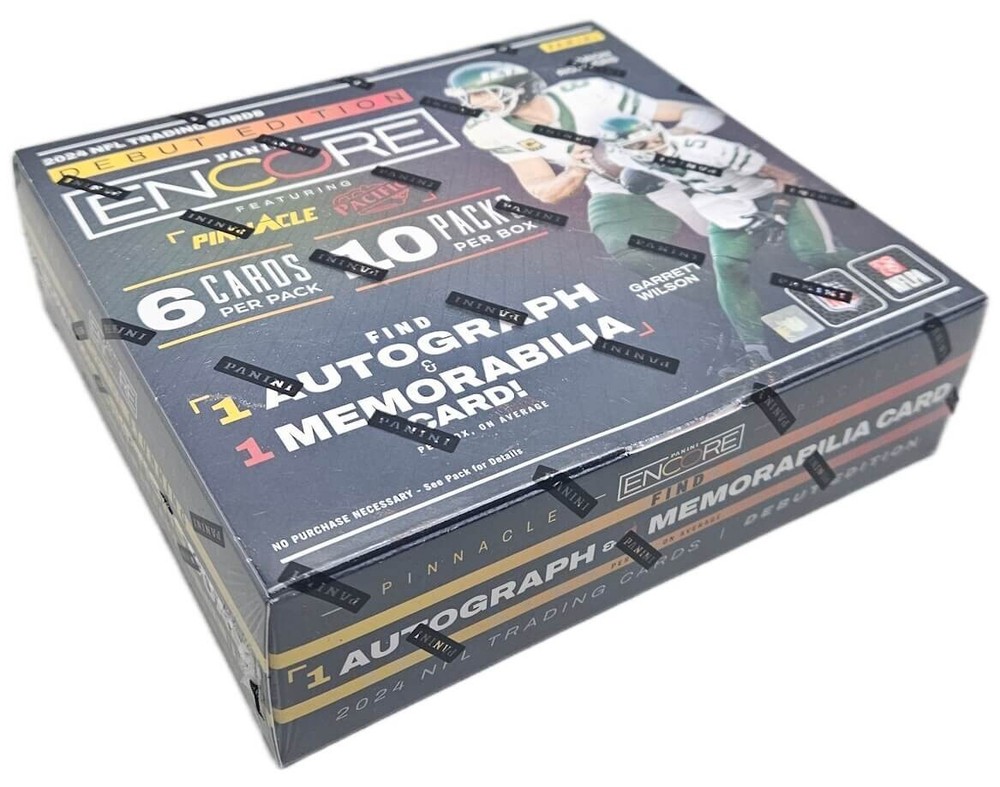 2024 Panini Encore Football - Sealed Hobby Box 10 Packs Per Box - 6 Cards Per Pack 1 Autograph and 1 Memorabilia Card Per Box Introducing 2024 Encore Football, a dynamic program, making its debut this season! Collectors can look forward to discovering card sets, featuring the top Superstars, Legends, and Rookies of the NFL. Discover 10 all-new inserts, featuring a 200-card base set. Also, keep an eye out for Autograph and Memorabilia cards from the games best players! In the strong 2024 rookie class, keep an eye out for standout players like Michael Penix Jr., Rome Odunze, Brian Thomas Jr., J.J. McCarthy, and several others! -1 Autograph -1 Memorabilia 10 Inserts 4 #’D Parallels Discover a 200-card base set that delivers a dynamic tribute to the NFL’s top superstars and standout rookies with a vibrant arsenal of parallels for the base, insert and autograph sets. Inserts: Panini Encore Football debuts with an exciting lineup of inserts, including Pinnacle Showcase, Panini Choice and 2024 Rookies! Autographs: Panini Encore features a robust autograph checklist containing the hottest rookies, the biggest current stars and legendary champions across a variety of compelling sets.