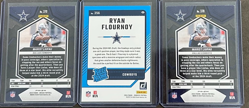 2024 Panini Football 3 card rookie parallel trading lot for the Dallas Cowboys! The cards are: 2024 Donruss Ryan Flournoy #356 RC Blue Press Proof Parallel 2024 Mosaic Marist Liufau #370 RC Green Mosaic Prizm Parallel 2024 Mosaic Marist Liufau #370 RC Pink Camo Mosaic Parallel