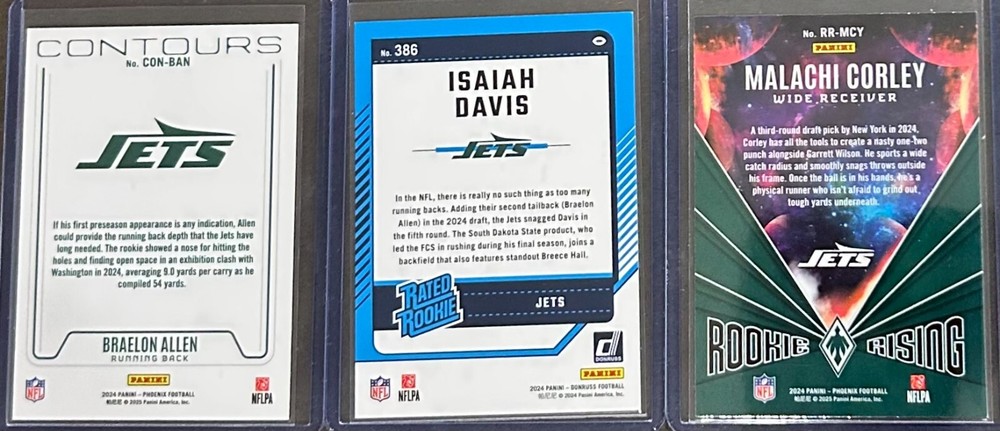 2024 Panini Football 3 card rookie insert/parallel trading lot for the New York Jets! The cards are: 2024 Phoenix Braelon Allen #CON-BAN RC Contours Insert, Hyper Parallel 2024 Donruss Isaiah Davis #386 RC Blue Press Proof Parallel 2024 Phoenix Malachi Corley #RR-MCY RC Rookie Rising Insert, Lazer Parallel