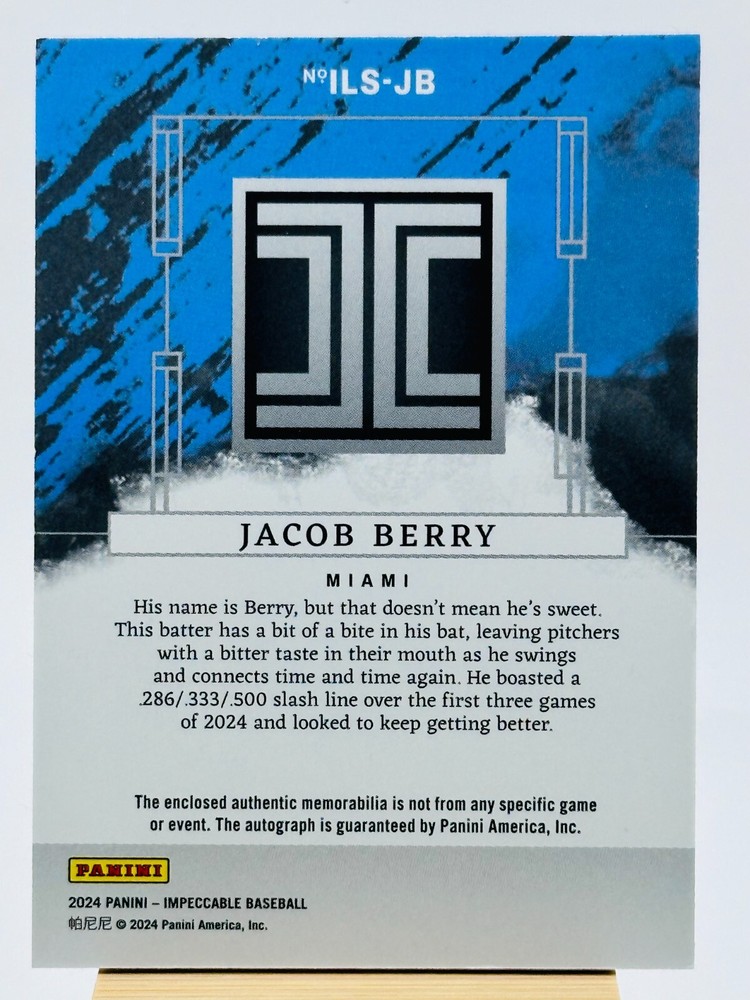 We ship all cards the same day or the very next morning for fast and reliable delivery! 2024 Panini Impeccable Impeccable Lumber Signatures #ILS-JB Jacob Berry /49 – Miami Marlins Up for sale is the 2024 Panini Impeccable Impeccable Lumber Signatures #ILS-JB Jacob Berry , a limited-edition autograph card numbered to just 49 copies . This stunning card features an on-card autograph from one of the Miami Marlins' promising young prospects, Jacob Berry , with a unique Lumber Signatures design . A must-have for collectors and Marlins fans! The card is in mint/near mint condition , carefully transferred directly from pack to penny sleeve. Card Details: Set: 2024 Panini Impeccable Card Number: ILS-JB Parallel: Impeccable Lumber Signatures Serial Number: /49 Player: Jacob Berry Team: Miami Marlins Condition: Mint/Near Mint (pack to penny sleeve) Player Highlights: Jacob Berry was a top draft pick by the Miami Marlins and is considered one of their most highly touted prospects . Known for his elite bat speed , power-hitting ability , and strong plate discipline , Berry is projected to be a key part of the Marlins' future lineup. This on-card autograph is a rare and valuable addition for baseball collectors and investors! Why Pick Us? Fast Shipping: We ship all cards the same day or the very next morning, ensuring quick and safe delivery. Hobbyist with Heart: As true collectors, we treat every card with the utmost care, packaging it securely for safe arrival. Family Fun: We're a family of collectors who enjoy opening packs together and adding to our personal collection. Every sale helps fund our next big break! Passion-Driven: We're selling cards to keep the fun going and to continue growing our hobby. Your support means the world to us! Thank you for checking out our listings and helping fuel our next pack-opening adventure! Tiki Card Guy & Kids
