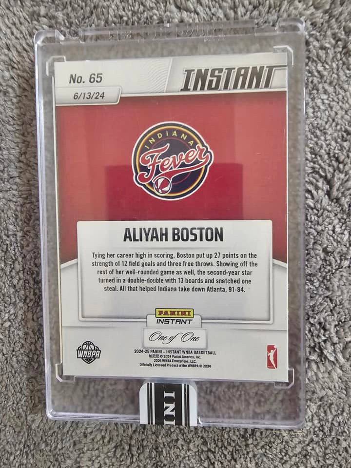 The card is a one-of-a-kind Blue Viper parallel,this rare 2024 Panini Instant WNBA trading card features Aliyah Boston, a standout player for the Indiana Fever and South Carolina Gamecocks. The card is a one-of-a-kind Blue Viper parallel, with a low print run of only one. It is a short print and exclusive insert, making it a highly sought-after item for collectors.In addition to its rarity, the card also boasts a high-quality design and printing. It is made of durable card stock with a thickness of 20 Pt. and features a serial number, making it a valuable addition to any collection. Don't miss your chance to own this unique and highly coveted sports trading card.