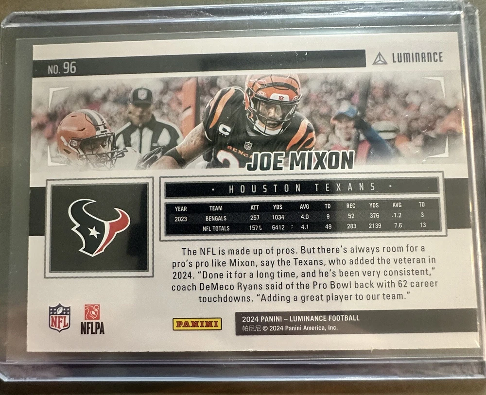 This 2024 Panini Luminance trading card features Joe Mixon of the Houston Texans in a Gold parallel/variety. The card is serial numbered 138/299 and is part of the base set. It is a sports trading card for football fans and collectors, manufactured by Panini in the year 2024. The card is in excellent shape and is near mint or better, ungraded. It is a great addition to any collection and perfect for fans of Joe Mixon and the Houston Texans. Get this card now before it's too late!