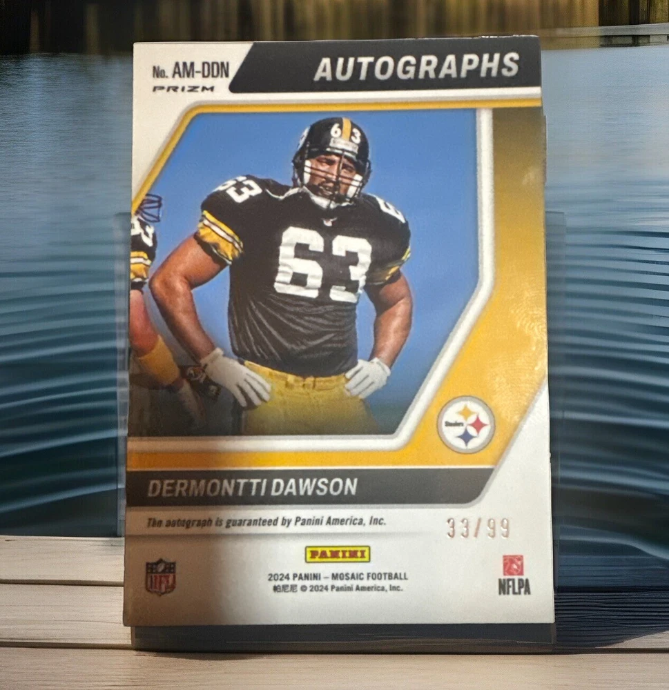 This rare and highly sought-after 2024 Panini Mosaic sports trading card features an authentic autograph from Dermontti Dawson, a former player for the Pittsburgh Steelers. With a print run of only 99, this card is a true gem for any sports trading card collector. The card is part of the Autographs Mosaic insert set and features a beautiful blue Mosaic Prizm parallel/variety. In addition to the autograph authentication from Panini Authentic, this card also boasts serial numbering and is ungraded. It is a near mint or better condition and comes from the National Football League (NFL). Don't miss out on the opportunity to add this rare card to your collection.