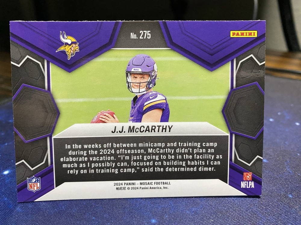 The product is a 2024 Panini Mosaic sports trading card featuring NFL rookie J.J. McCarthy of the Minnesota Vikings. This card is part of the base set for the 2024 season and is labeled with card number 275. As a non-graded card in excellent condition, it is a sought-after collectible for football fans and card collectors alike. The card showcases the player in his debut season in the National Football League, making it a valuable addition to any sports memorabilia collection.