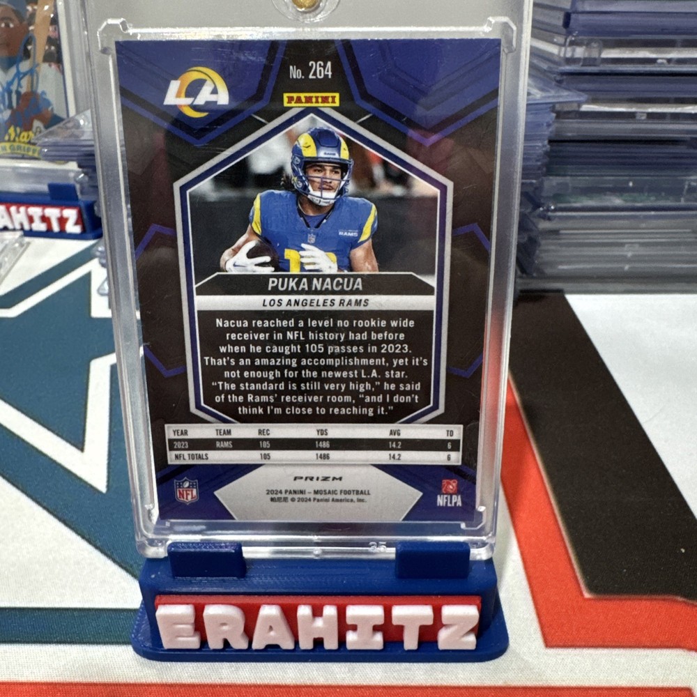 The 2024 Panini Mosaic National Pride Puka Nacua #264 Honeycomb Prizm football trading card is a highly sought-after collectible item for fans of the Los Angeles Rams and the National Football League. With its unique Honeycomb Prizm parallel variety and base set design, this card features the talented player Puka Nacua in a standout display. As part of the excellent condition set, this card is a must-have for any football card collector looking to add a rare and special piece to their collection. Beautiful card, has 1 lil print ding on the silver on flag shown in pic