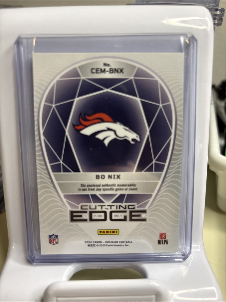 The product is a 2024 Panini Obsidian Cutting Edge Materials Bo Nix trading card featuring the Denver Broncos rookie player. The card is made of card stock and includes materials from the Cutting Edge Materials insert set. It is an original autographed card with an autograph format of cut, authenticated by Panini Authentic. This sports trading card is in English and is a part of the National Football League (NFL) set for the 2024 season.