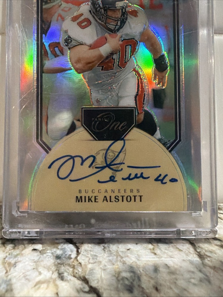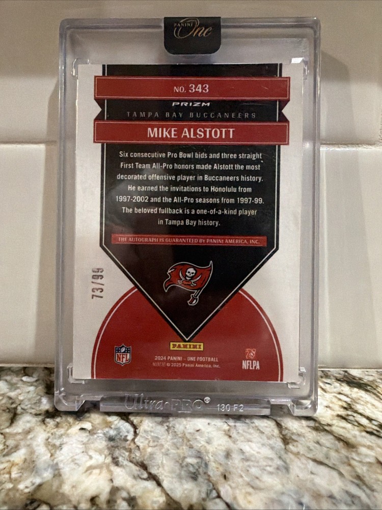 The 2024 Panini One - Once in a Franchise Autographs Mike Alstott #343 /99 is a highly collectible sports trading card from the National Football League (NFL). This limited edition card features the autograph of former Tampa Bay Buccaneers player Mike Alstott and is serial numbered to 99, making it a rare find for football card collectors. With its exclusive print run and premium features, this card is a valuable addition to any sports memorabilia collection, showcasing a piece of NFL history with a modern twist. Bucs Legend, uncirculated, sealed by panini