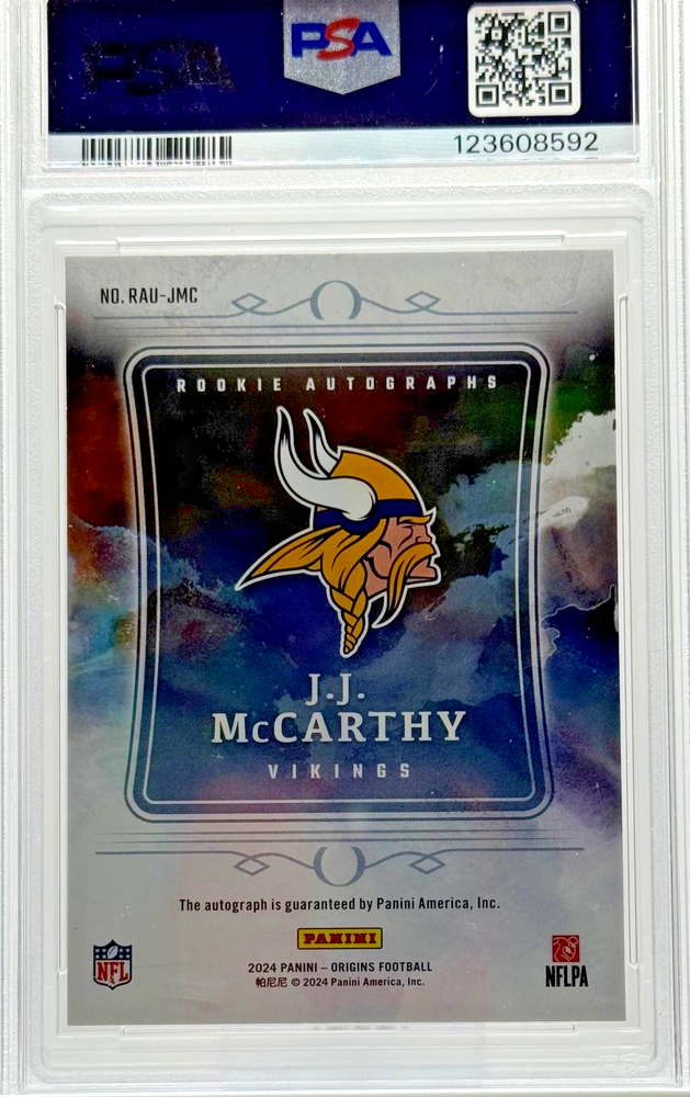 The 2024 Panini Origins Rookie Autographs J.J. McCarthy #RAU-JMC trading card is a highly sought-after collectible item in the sports trading card market. This card features a hard-signed autograph of the talented rookie player J.J. McCarthy, making it a valuable addition to any football card collection. Manufactured by Panini, this original card from the Panini Origins series showcases the player's autograph authenticated by Panini Authentic, adding to its authenticity and appeal. With a standard size and made of 20 Pt. card thickness, this card is a must-have for fans of the Minnesota Vikings and football enthusiasts alike. The 2024 Panini Origins J.J. McCarthy Rookie Autograph card is considered a rare collectible, especially in a perfect PSA 10 GEM MT condition. Factors Contributing to Rarity Autographed Rookie Card: This card is a "Rookie Autograph" (RC Auto), which is one of the most sought-after types of cards for a new player. PSA 10 Grade: The card has been graded by Professional Sports Authenticator (PSA) as a perfect 10, or "Gem Mint". Achieving this top grade is difficult and makes the card significantly more valuable and scarce than lower-graded versions. Limited Production: Panini often uses limited print runs for specific parallels in the Origins set. While the base autograph does not have a specific number printed on the card itself, other variations of this card (e.g., the Blue parallel is limited to 49 copies, the Gold to 10, and the Red to 99) have very low production numbers, indicating the overall scarcity of this specific type of card in the set. The combination of the player's rookie status, the on-card autograph, and the perfect condition makes this an extremely desirable and rare item in the sports card market.