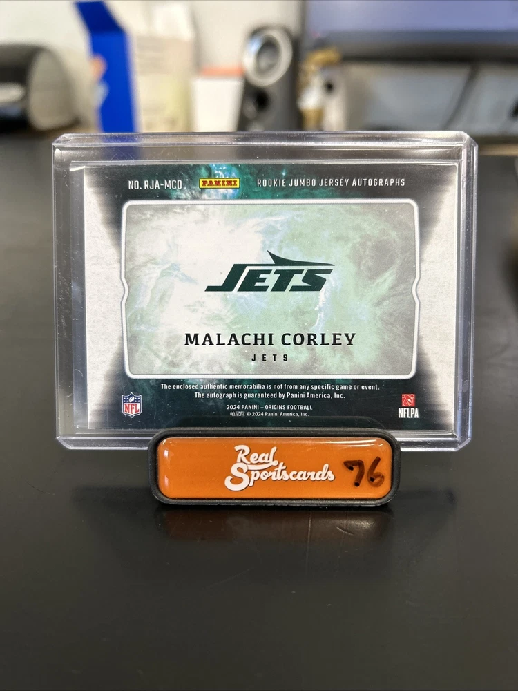 This rare and highly sought-after trading card features an autographed jumbo relic of Malachi Corley, a promising rookie from the National Football League (NFL) playing for the New York Jets. The card is part of the 2024 Panini Origins set and boasts a parallel/variety of rookie jumbo jersey auto, making it a true gem for sports trading card collectors. In addition to the autograph and memorabilia, this card also features an insert and is numbered RJA-MCO. Don't miss your chance to own this amazing piece of sports history.
