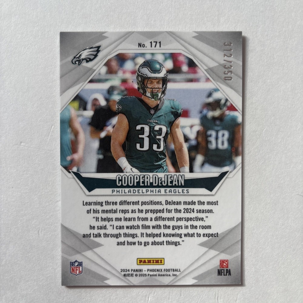 The 2024 Panini Phoenix Rookies Cooper DeJean #171 Fire Burst /350 trading card is a highly sought-after collectible for fans of the National Football League. Featuring the rookie player Cooper Dejean from the Philadelphia Eagles, this limited edition card is part of the Panini Phoenix set and showcases a unique Fire Burst parallel variety. With only 350 copies produced, this serial-numbered card is a valuable addition to any football card collection, especially for collectors looking to own a piece of the 2024 season.