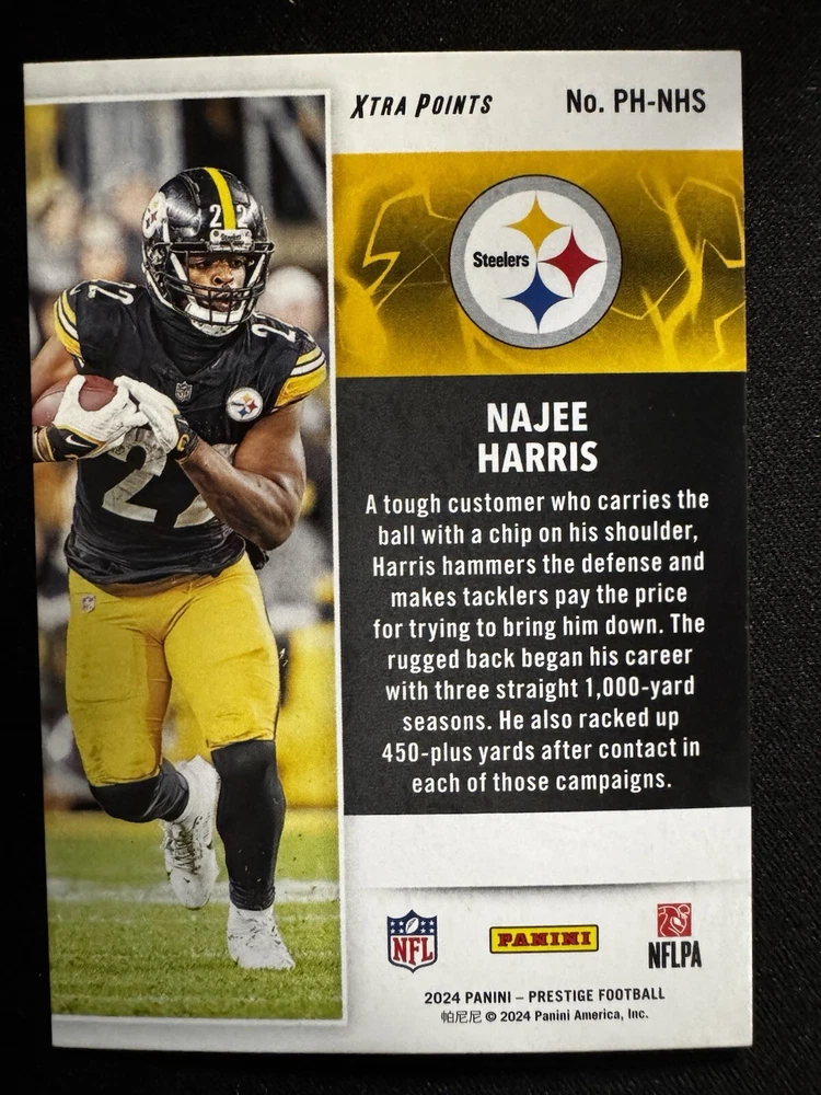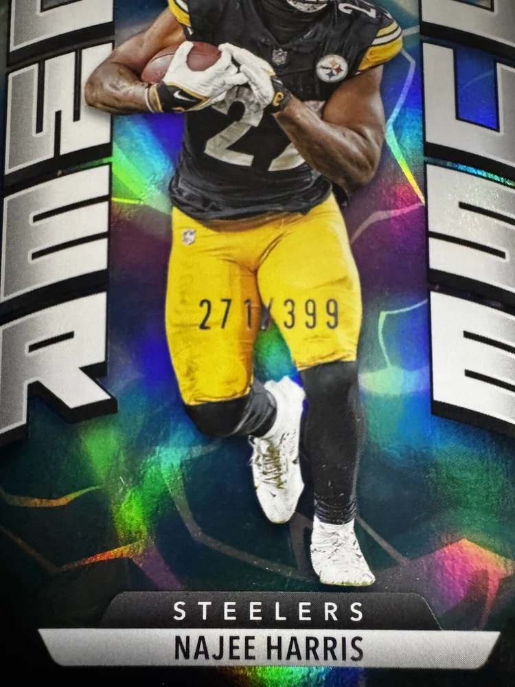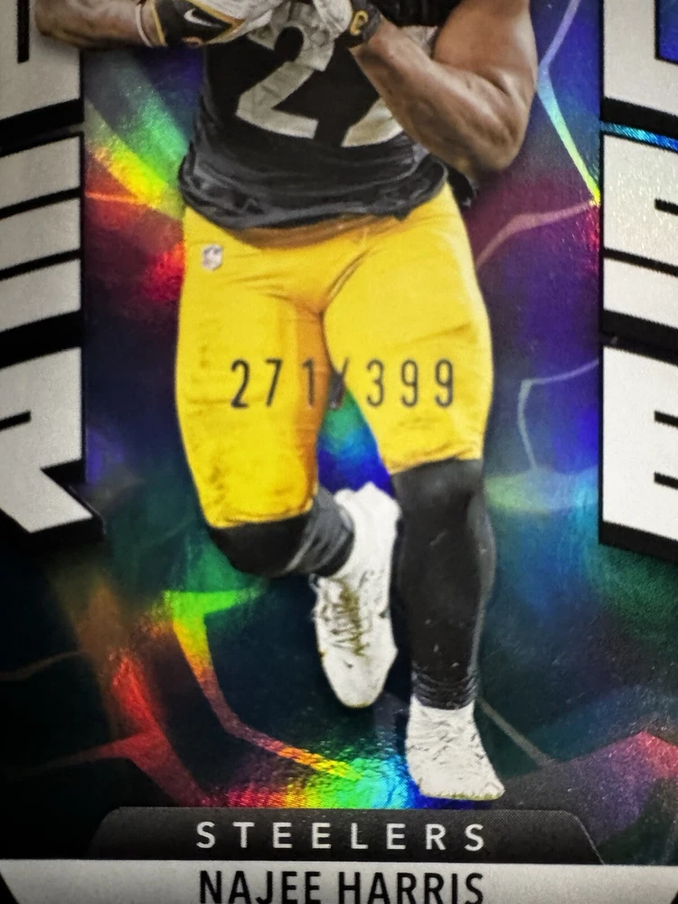 This 2024 Panini Prestige trading card features Najee Harris of the Pittsburgh Steelers in the Power House Red parallel variety. The card is numbered #271 out of 399 and is a must-have for any fan or collector of football memorabilia. This card is a part of the National Football League (NFL) set and is manufactured by Panini.