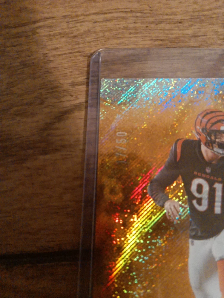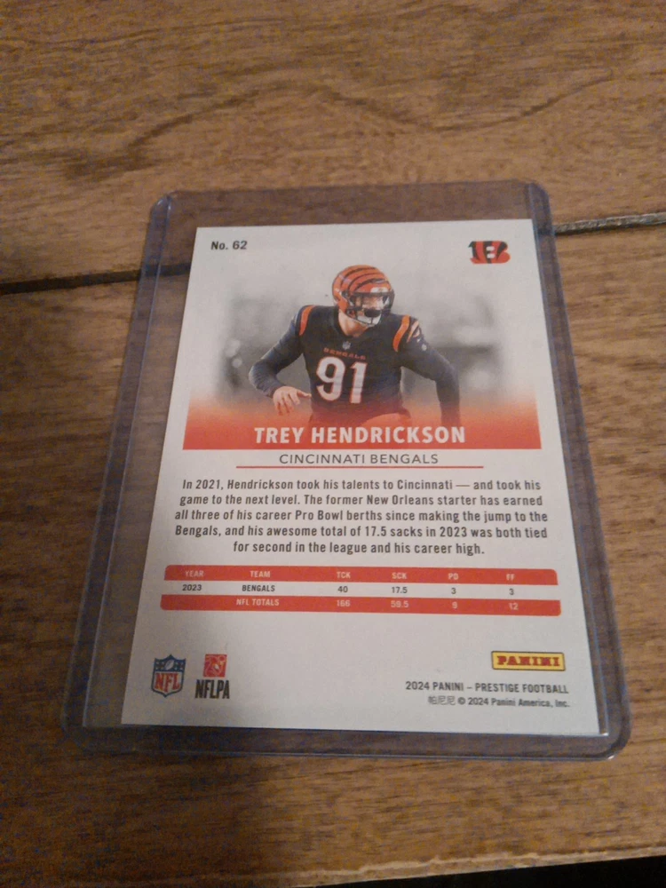 This is a 2024 Panini Prestige sports trading card featuring Trey Hendrickson of the Cincinnati Bengals. The card is a Premium Gold parallel numbered out of 75. It is part of the Xtra Points subset in the set, showcasing the player in near-mint or better condition. The card is not autographed and is ungraded.