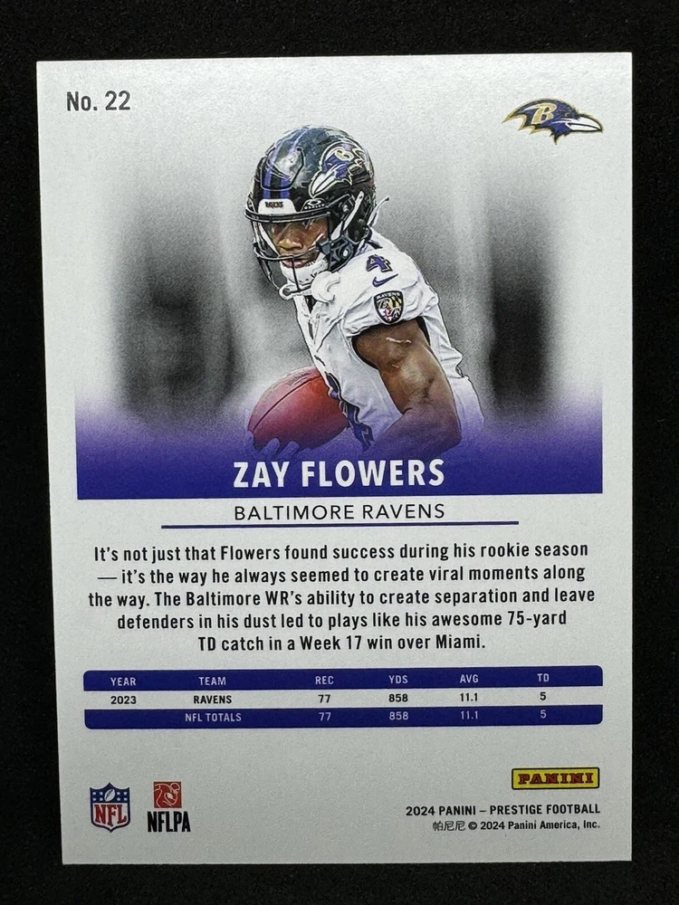 Parallel/Variety: Gold Season: 2024 Sport: Football Features: Short Print Player/Athlete: Zay Flowers League: National Football League (NFL) Card Number: 22 Manufacturer: Panini Team: Baltimore Ravens Set: 2024 Panini Prestige Type: Sports Trading Card