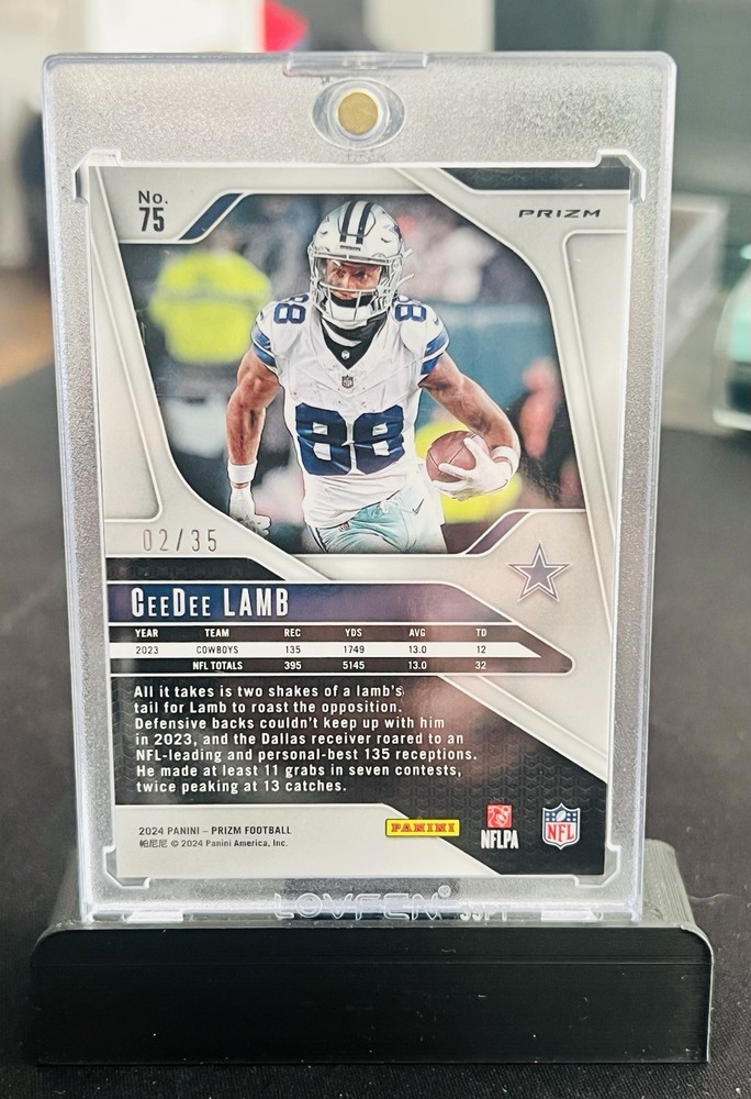 The 2024 Panini Prizm CeeDee Lamb #75 Red Shimmer Prizm /35 is a highly sought-after sports trading card featuring the talented football player from the Dallas Cowboys. This limited edition card is part of the 2024 Panini Prizm set and is a rare Red Shimmer Prizm parallel with a print run of only 9/35 copies. With its serial numbering and exclusive features, this card is a must-have for any serious football trading card collector looking to add a special piece to their collection.