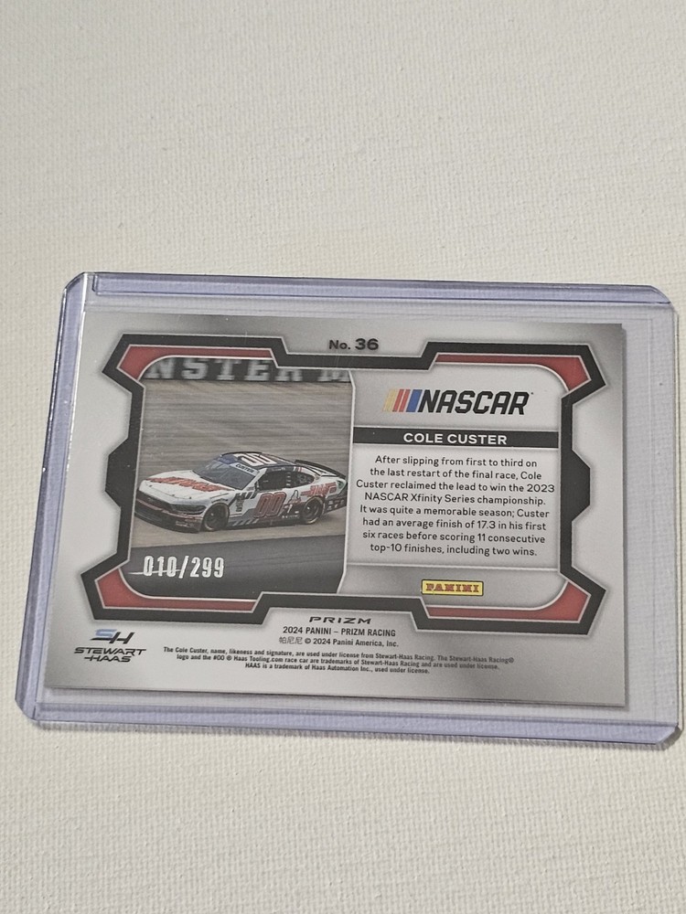 2024 Panini Prizm Cole Custer Red #/299 #36 trading card features Cole Custer of Stewart-Haas Racing in the RACING sport. The card is from the Red insert set, manufactured by Prizm in 2024. It is numbered out of 299 and includes a serial number. The card is not autographed and is a part of the 2024 Panini Prizm set.