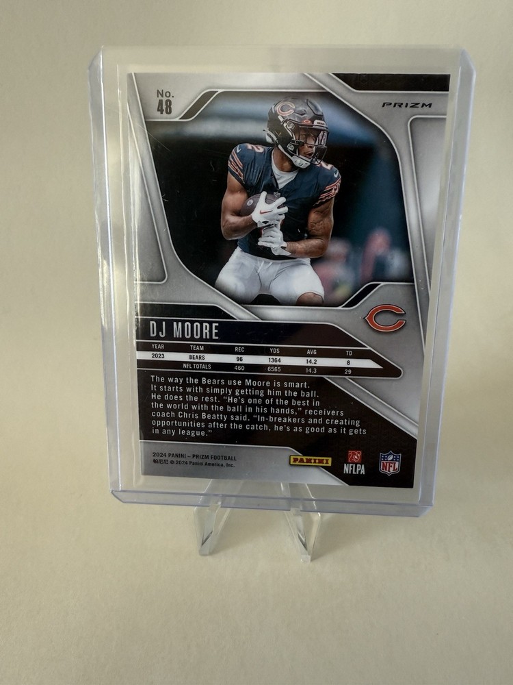 The 2024 Panini Prizm D.J. Moore #48 TRUE SILVER card is a standard-sized sports trading card featuring the player D.J. Moore from the Chicago Bears in the National Football League (NFL). Manufactured by Panini, this original card is made of card stock with a thickness of 20 Pt. It is part of the 2024 Panini Prizm set and belongs to the Silver Prizm parallel/variety. The card is ungraded and in near mint condition or better, making it a valuable collectible for fans and collectors.