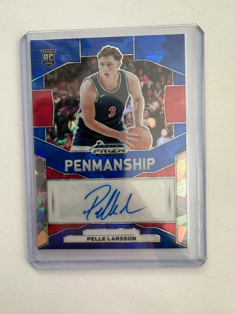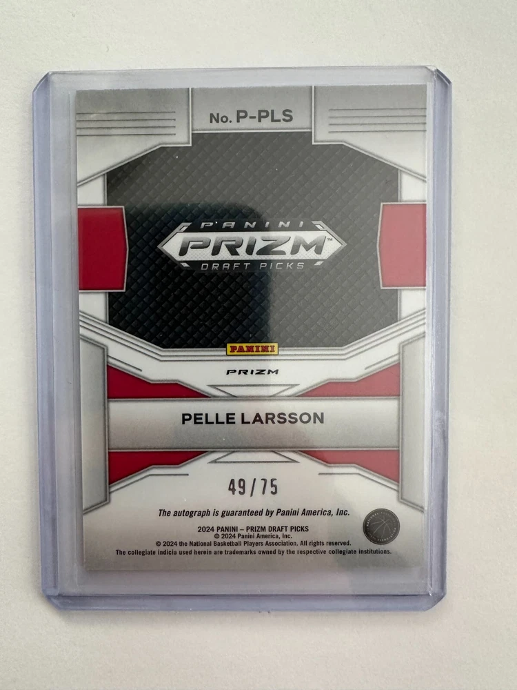 The 2024 Panini Prizm Draft - Blue Ice Prizm Auto #P-PLS Pelle Larsson 49/75 is a sports trading card featuring basketball player Pelle Larsson. Produced by Panini, this card is part of the National Collegiate Athletic Association (NCAA) league. The Blue Ice Prizm Auto variation is limited to 75 copies, making it a valuable collectible for fans and collectors.