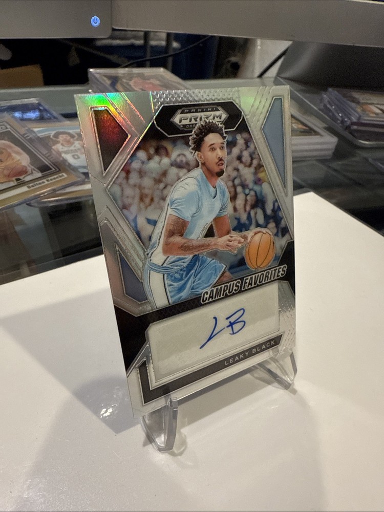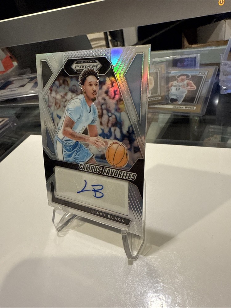 The product is a 2024 Panini Prizm sports trading card featuring Leaky Black from the North Carolina Tar Heels basketball team. This card is part of the Campus Favorites subset and is a Silver parallel variety with an autograph from the player. It is a sought-after collectible item for fans of college basketball and sports trading cards, showcasing Leaky Black in his UNC uniform.