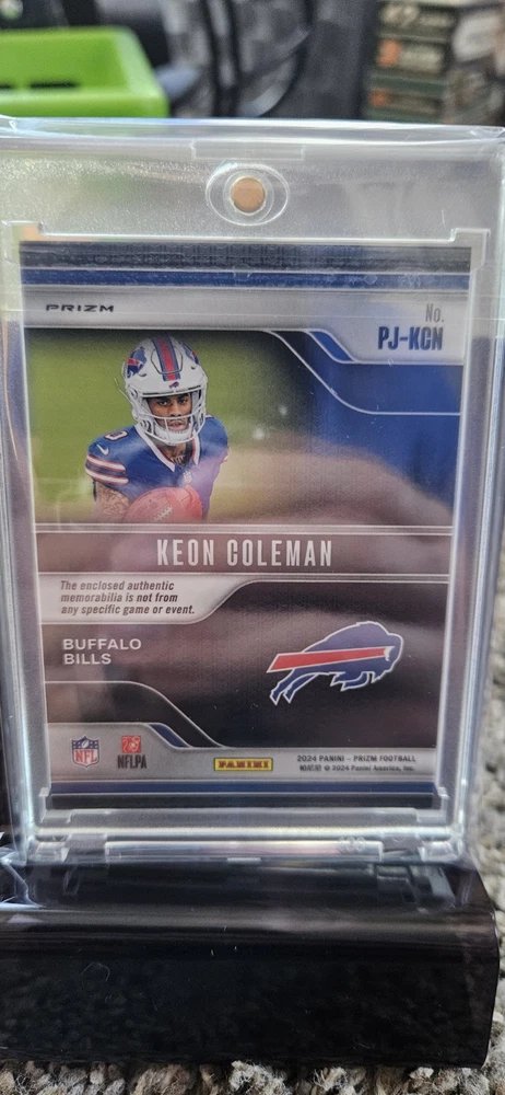 The 2024 Panini Prizm Keon Coleman Premier Jerseys trading card features a rookie player from the Buffalo Bills in the National Football League (NFL). This card is part of the Premier Jerseys insert set, showcasing memorabilia from the player. As an ungraded card, it is in near mint or better condition, making it a valuable addition to any football card collection. With its Prizm parallel variety, this card offers a unique and collectible item for fans of Keon Coleman and the Buffalo Bills.
