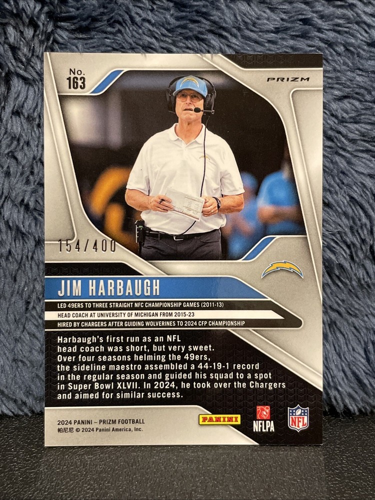 Season:2024Player/Athlete:Jim HarbaughFeatures:Serial Numbered, Base SetOriginal/Licensed Reprint:OriginalCountry/Region of Manufacture:United StatesTeam:Los Angeles ChargersLeague:National Football League (NFL)Set:2024 Panini PrizmVintage:NoYear Manufactured:2024Manufacturer:PaniniAutographed:NoSport:FootballCard Number:163Material:Card StockParallel/Variety:PrizmType:Sports Trading CardPrint Run:400