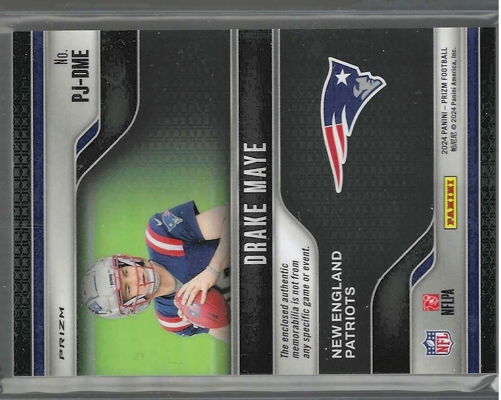 The product is a 2024 Panini Prizm trading card featuring Drake Maye, a player from the New England Patriots. This card is part of the Premier Jerseys insert set and includes a memorabilia swatch from Maye. It is not autographed but is authenticated by Panini Authentic. This rookie card is printed on card stock and is in near mint condition. The card is an original release and is part of the National Football League (NFL) league, making it a valuable addition to any football card collection.