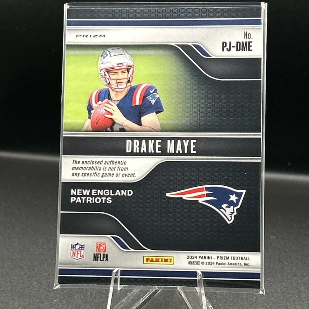 The product is a 2024 Panini Prizm trading card featuring Drake Maye of the New England Patriots. This card is from the Premier Jerseys insert set and includes a piece of memorabilia. It is a Rookie card with a Silver Prizm parallel design, in near mint or better condition. The card number is PJ-DME, and it is part of the 2024 football season collection.