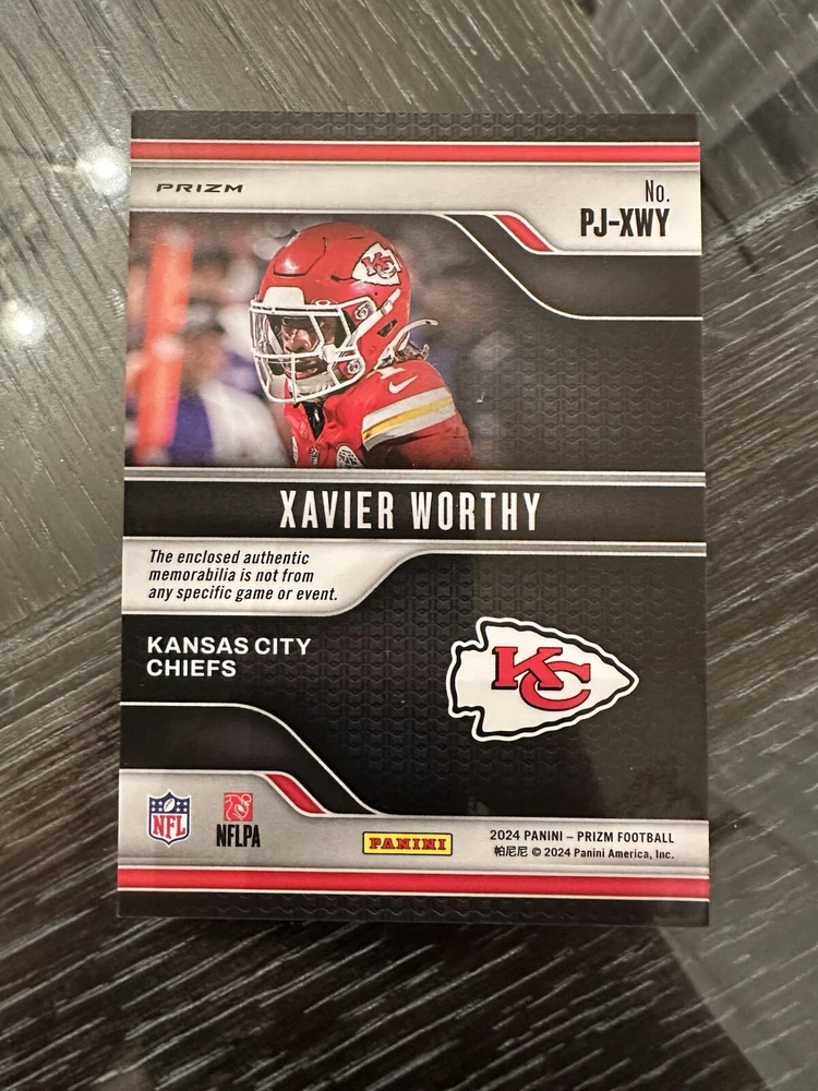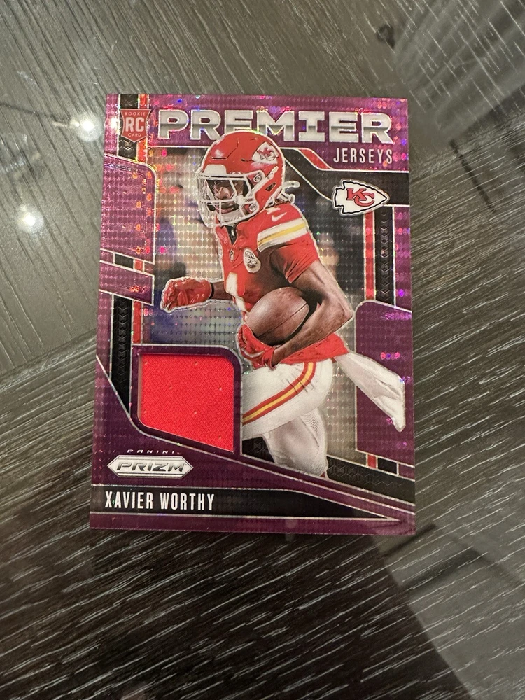 The 2024 Panini Prizm Xavier Worthy Premier Jerseys Purple Pulsar Prizm trading card features a memorabilia swatch from a Kansas City Chiefs jersey worn by the player. This rookie card is part of the Premier Jerseys insert set and showcases a parallel variety with a Purple Pulsar Prizm design. The card is ungraded and in near mint or better condition, making it a highly collectible item for fans of Xavier Worthy and football trading cards.