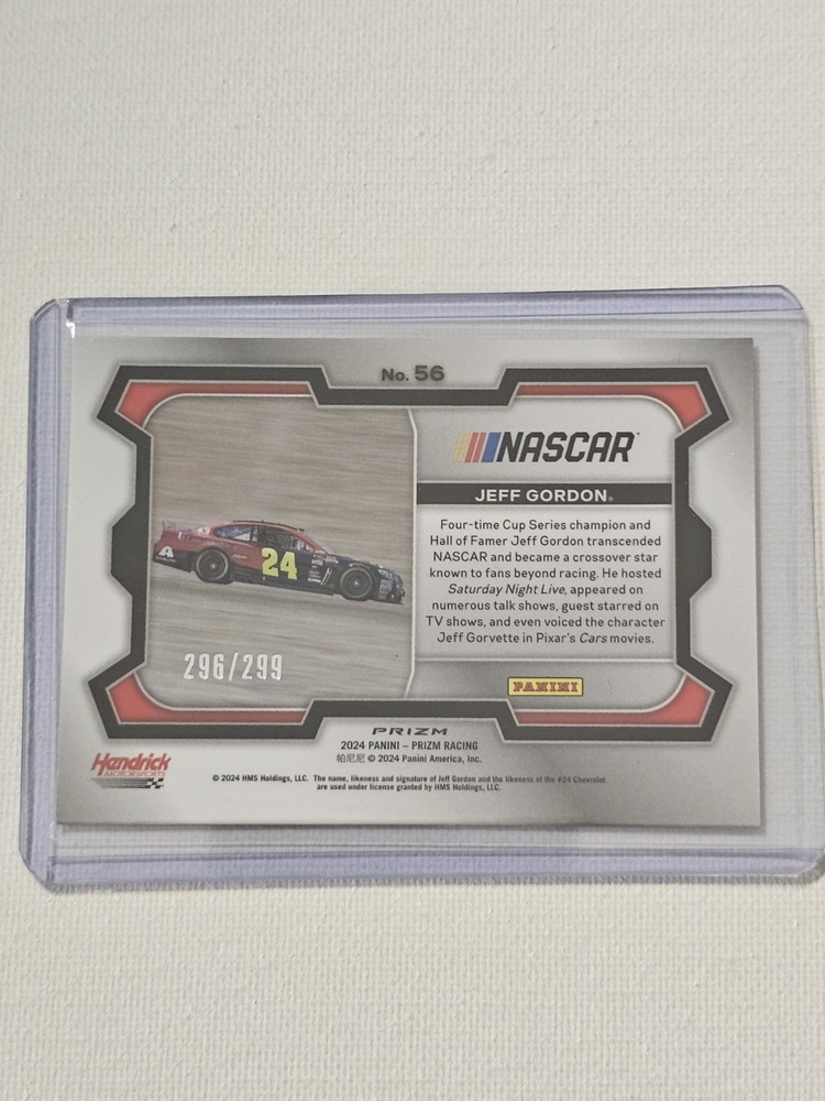 This is a 2024 Panini Prizm Racing trading card featuring NASCAR legend Jeff Gordon driving for Hendrick Motorsports. The card is a Red Prizm parallel with a print run of 299, serial numbered, and part of the Nascar Rides subset. It showcases a color match design and is numbered out of 299. This collectible card is an original release by Panini for the 2024 season.