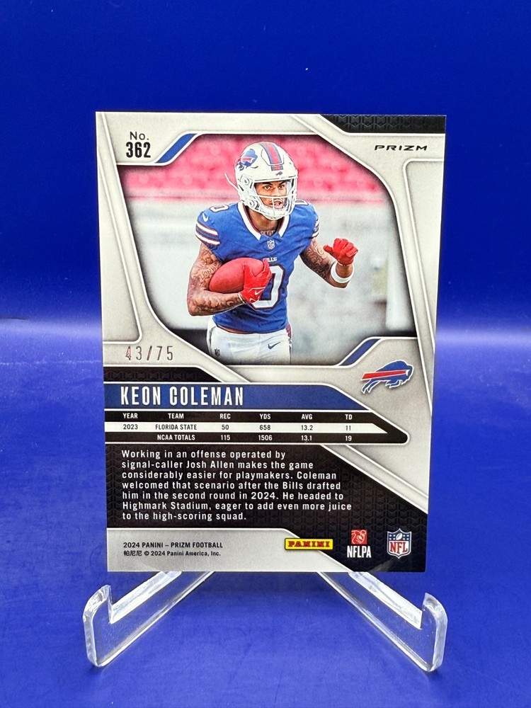 The 2024 Panini Prizm Rookie Keon Coleman /75 Red No Huddle Prizm #362 trading card is a highly collectible sports trading card featuring the Buffalo Bills rookie player. With a limited print run of only 75, this parallel variety card is serial numbered and part of the base set for the 2024 Panini Prizm collection. As a red no huddle prizm card, it is sure to be a standout addition to any football card collection, especially for fans of the Buffalo Bills and Keon Coleman.