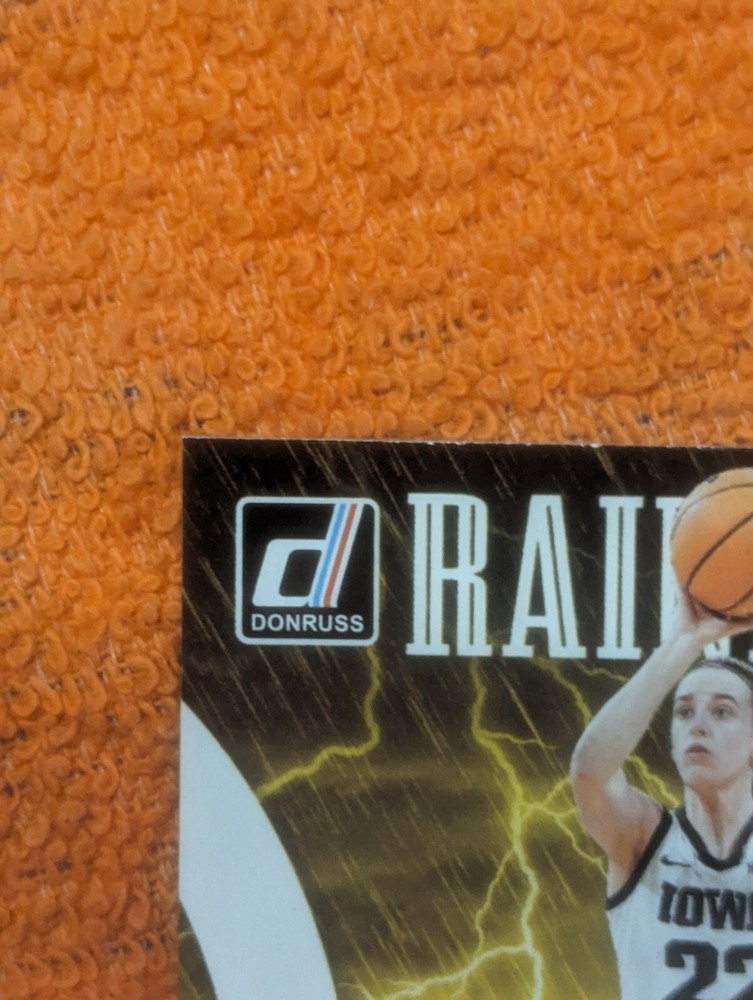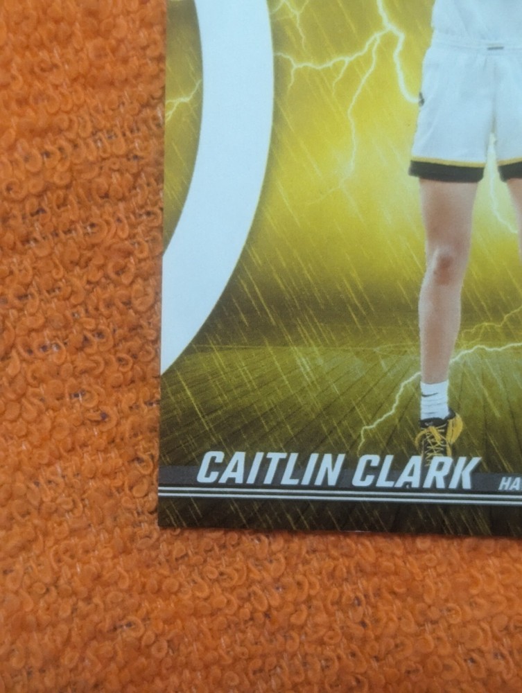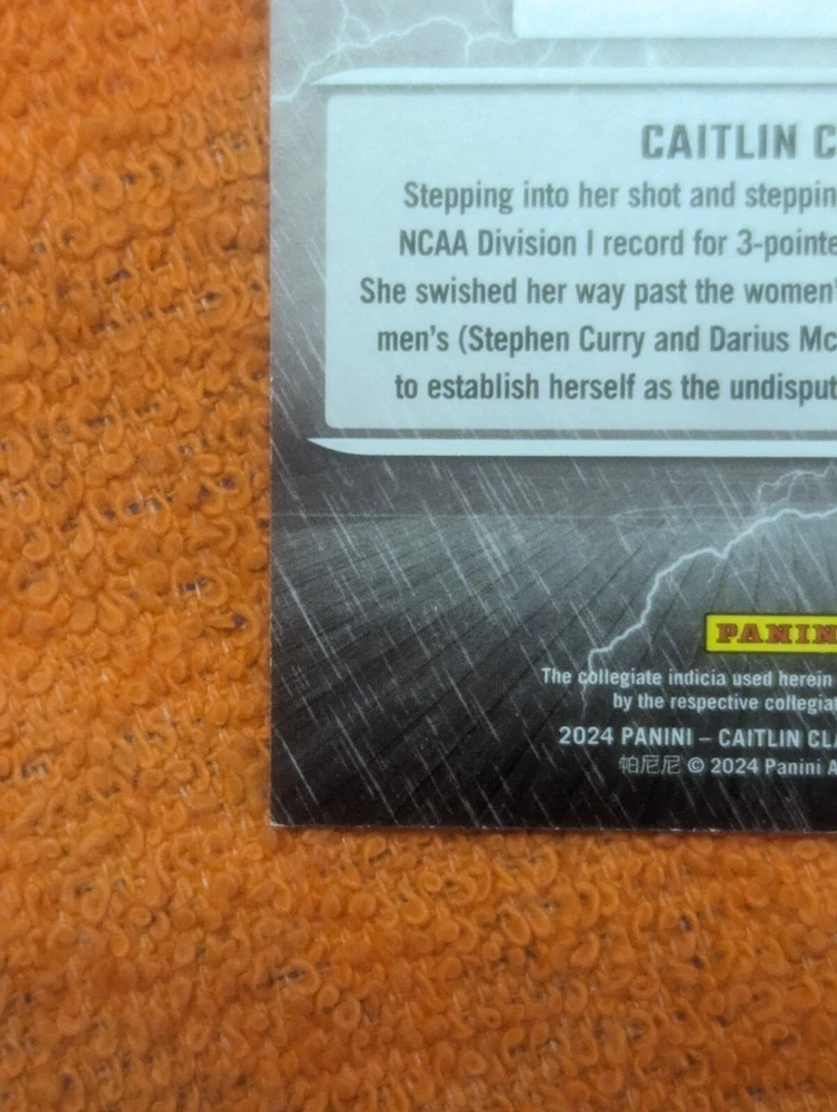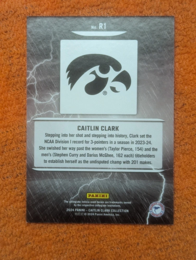 The product is a 2024 Panini Caitlin Clark Collection trading card featuring the "Raining 3s" insert design. It showcases Caitlin Clark, a player for the Iowa Hawkeyes in the WNBA. This sports trading card is part of the base set and does not have an autograph. The card is in excellent condition and is ungraded. With a focus on Caitlin Clark's basketball skills, specifically her ability to make 3-point shots, this card is a desirable collectible for fans of the sport and the player.