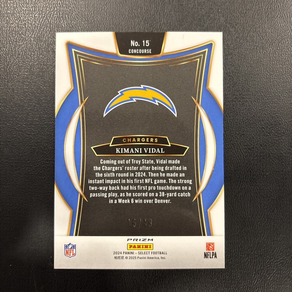 The product is a 2024 Panini Select Concourse Kimani Vidal #15 Orange Prizm trading card, featuring a rookie player from the Los Angeles Chargers in the National Football League. This card has a limited print run of 49, manufactured by Panini with an autograph from Jakobi Meyers. The card is made of 20 Pt. card stock with an authentic Panini autograph and is part of the Panini Select set. It is a sought-after item for collectors due to its rarity and association with a promising rookie player in the NFL.