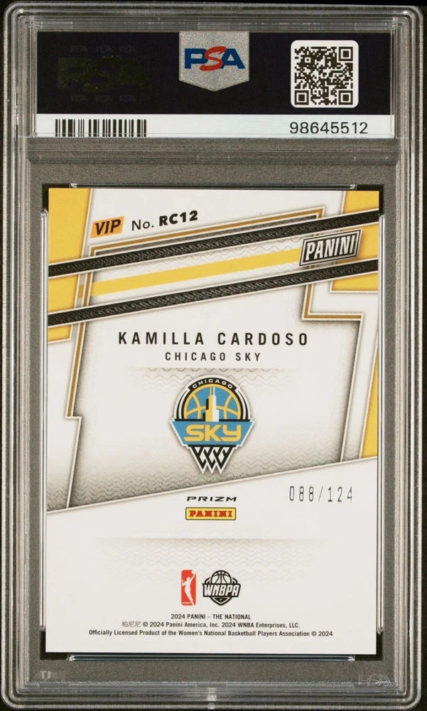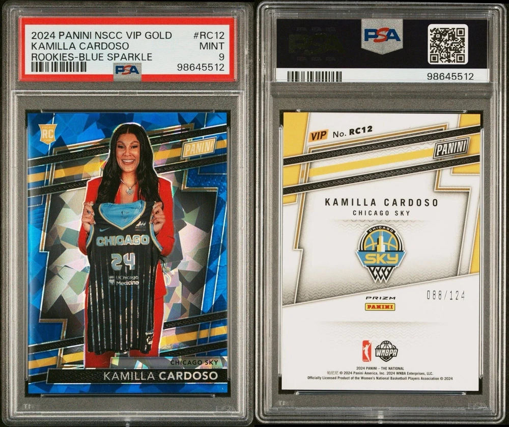 This 2024 Panini VIP Gold Kamilla Cardoso Blue Sparkle /124 Rookie Card is a must-have for any fan of the Women's National Basketball Association (WNBA). The card features a stunning design and is part of the 2024 Panini set. It is also serial numbered and has a grade of 9 from the Professional Sports Authenticator (PSA). The card represents Kamilla Cardoso, a player for the Chicago Sky team, and is a sports trading card with a print run of 124. The sparkle parallel/variety adds a unique touch to the card. It is perfect for collectors and fans alike who are looking for a rare and valuable addition to their collection.