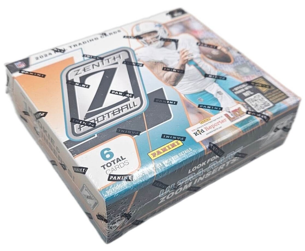 2024 Panini Zenith Football - Sealed Hobby Box 1 Pack Per Box - 6 Cards Per Pack 2 Autographs Per Box The unique Zenith Football franchise returns for 2024 with a dinstinctly “Zenith” look and feel, featuring the brand’s popular designs and inserts that have collectors covered from A to Z. Find chase-worthy RPAs, featuring autographs and either one, two, three, four or five pieces of memorabilia numbered from 399 all the way down to 1! Look for a zesty array of inserts that is undeniably “Zenith,” including the fabled Z-Team as well as Z-Marquee and so much more. 2024 Zenith Football also includes a special Contenders Optic Rookie Ticket and Veteran Ticket Preview insert, numbered to 24. 1 Patch Autograph 1 Additional Autograph 1 Base Card 1 Rookie Card 2 Inserts 2024 Zenith Football boasts a 200-card base set, including 100 of the biggest stars in the game as well as 100 of the top Rookies. Autographs: Chase an exciting ensemble of autograph and autograph memorabilia cards from the NFL’s top stars, brightest rookies and greatest legends. Inserts: Look for an array of inserts that is undeniably “Zenith,” including the fabled Z-Team, A to Z as well as Z-Stars.