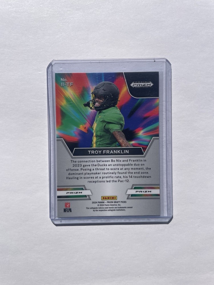 Player/Athlete: Troy Franklin Team: Denver Broncos, Oregon Ducks Sport: Football Type: Sports Trading Card Season: 2024 League: National Collegiate Athletic Association (NCAA), National Football League (NFL) Year Manufactured: 2024 Material: Card Stock Set: 2024 Panini Prizm Draft Picks Vintage: No Parallel/Variety: Green Manufacturer: Panini Features: Parallel/Variety, Rookie Autographed: No Card Size: Standard