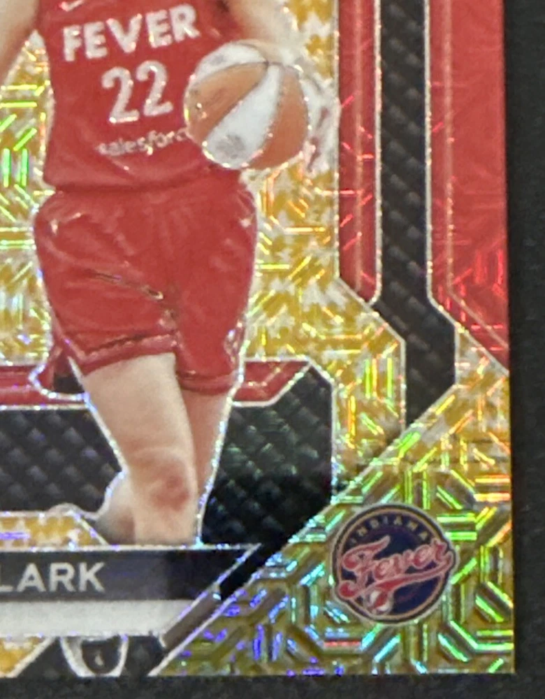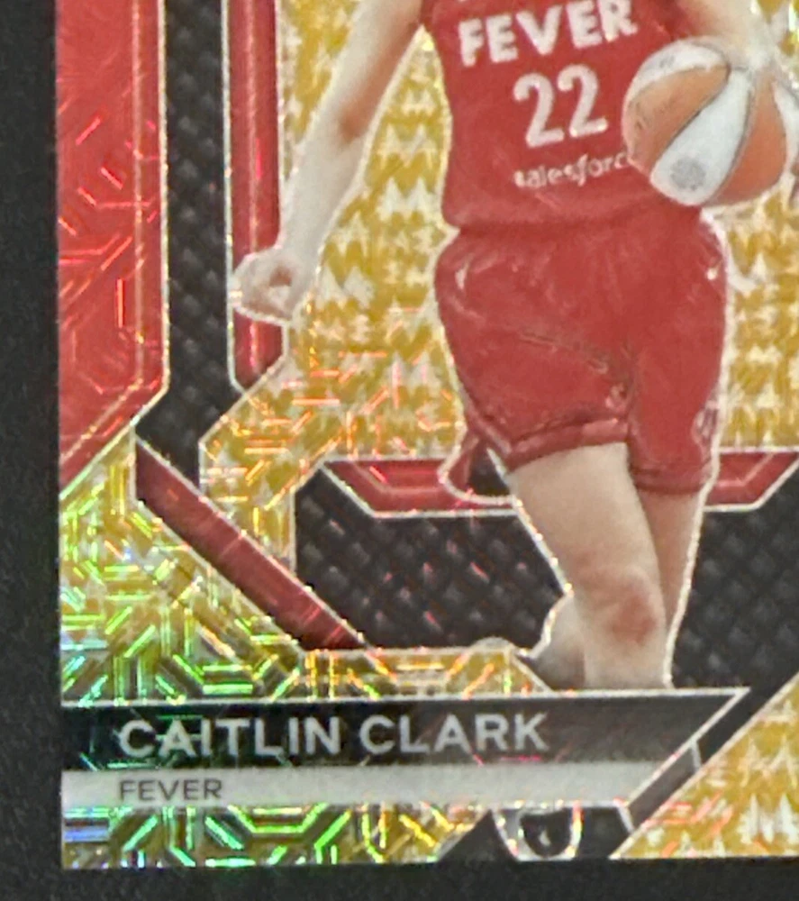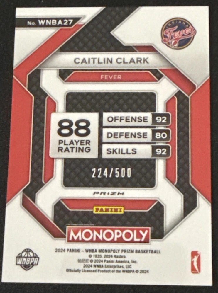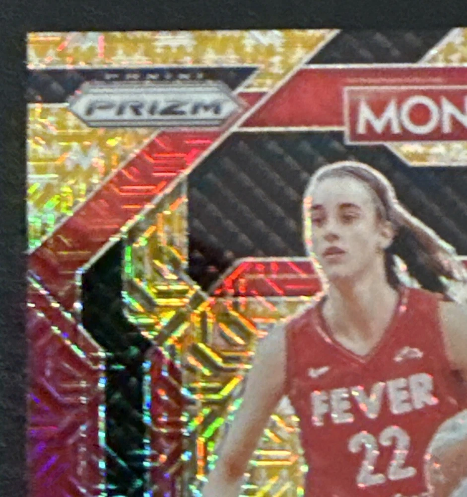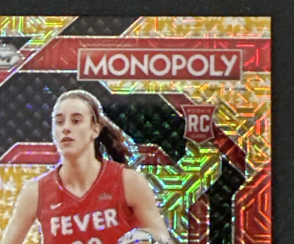 The product is a 2024 Prizm Monopoly trading card featuring Caitlin Clark of the Indiana Fever in the Women's National Basketball Association (WNBA). This rookie card is a Gold Millionaire Shimmer parallel variety, serial numbered out of 500, making it a rare find for collectors.